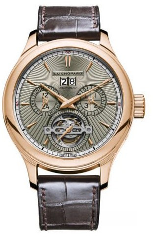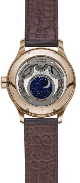 Часы Chopard L.U.C XP All-In-One представлены в корпусе размером 46 x 18.5 мм из розового золота 18к водонепроницаемостью 30 метров. Внутри корпуса установлен механизм с ручным заводом, Калибр L.U.C 05.01-L, сертифицированный хронометр COSC, обладающий запасом хода 7 дней. На сером гильошированном циферблате отображаются часы, минуты, секунды, дата, день недели, месяц, запас хода, фаза луны, цикл високосного года, указатель день/ночь, уравнение времени, время восхода/захода солнца, запас хода. Часы поставляются на ремешке из кожи аллигатора с вставкой из розового золота 18к. Серия ограничена - 10 шт.