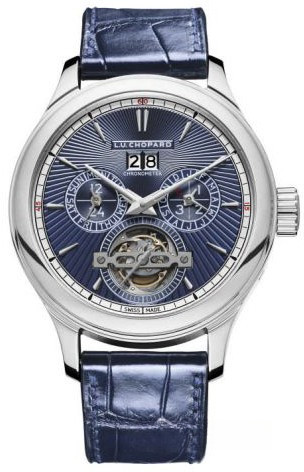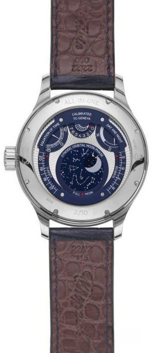 Часы Chopard L.U.C XP All-In-One представлены в корпусе размером 46 x 18.5 мм из платины 950 водонепроницаемостью 30 метров. Внутри корпуса установлен механизм с ручным заводом, Калибр L.U.C 05.01-L, сертифицированный хронометр COSC, обладающий запасом хода 7 дней. На синем гильошированном циферблате отображаются часы, минуты, секунды, дата, день недели, месяц, запас хода, фаза луны, цикл високосного года, указатель день/ночь, уравнение времени, время восхода/захода солнца, запас хода. Часы поставляются на ремешке из кожи аллигатора с вставкой из платины 950. Серия ограничена - 10 шт.