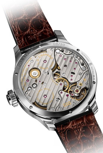 Chopard запускает свой первый минутный репетир: L.U.C. Full Strike. Эти часы отбивают часы, четверти и минуты на прозрачных сапфировых хрустальных гонгах. Калибр 08.01-L потребовал почти 15 000 часов разработки и 3 патента. Новая модель L.U.C Full Strike благодаря необыкновенному звучанию корпуса диаметром 42,5 мм из белого золота 18к, скелетированному циферблату удостоилась отличительного знака качества Poinçon de Genève.