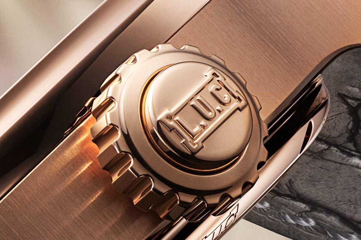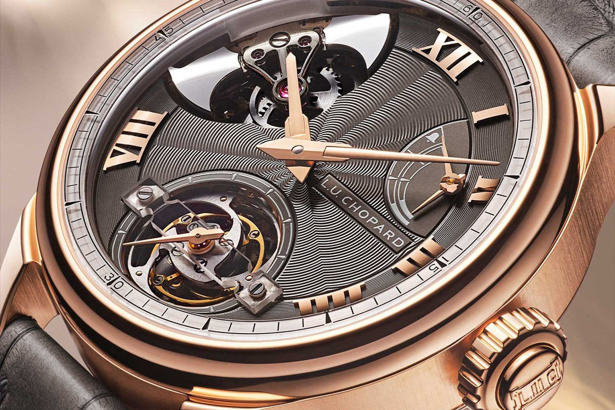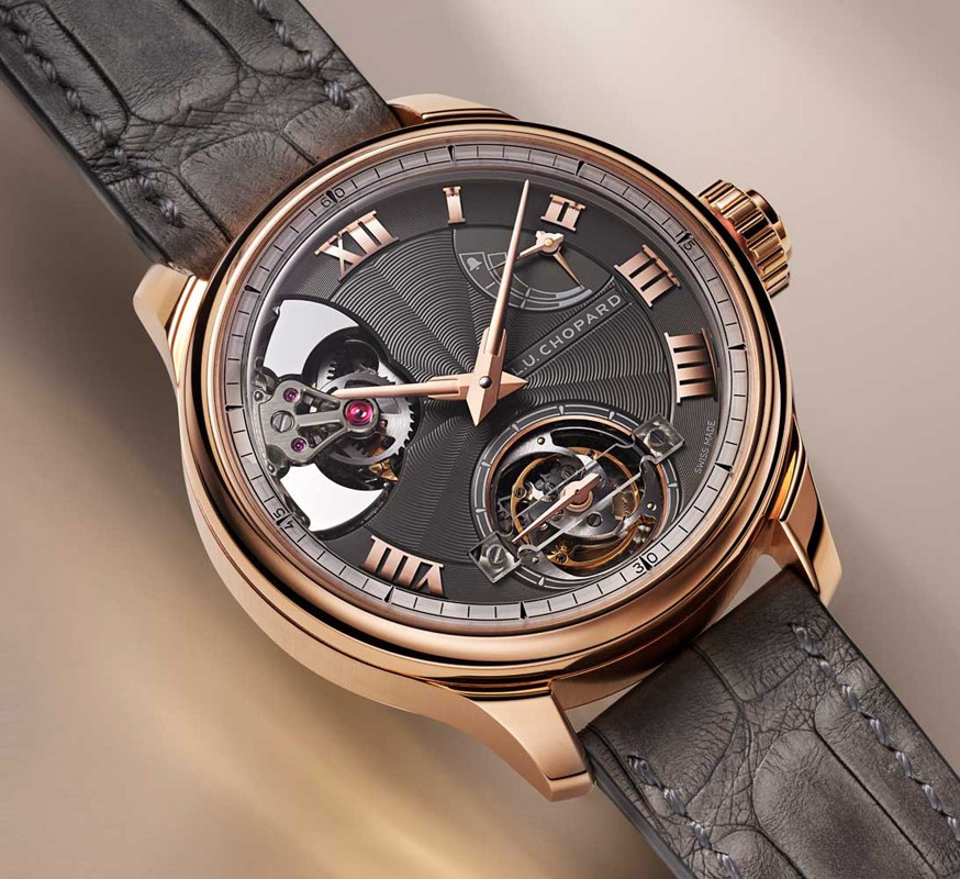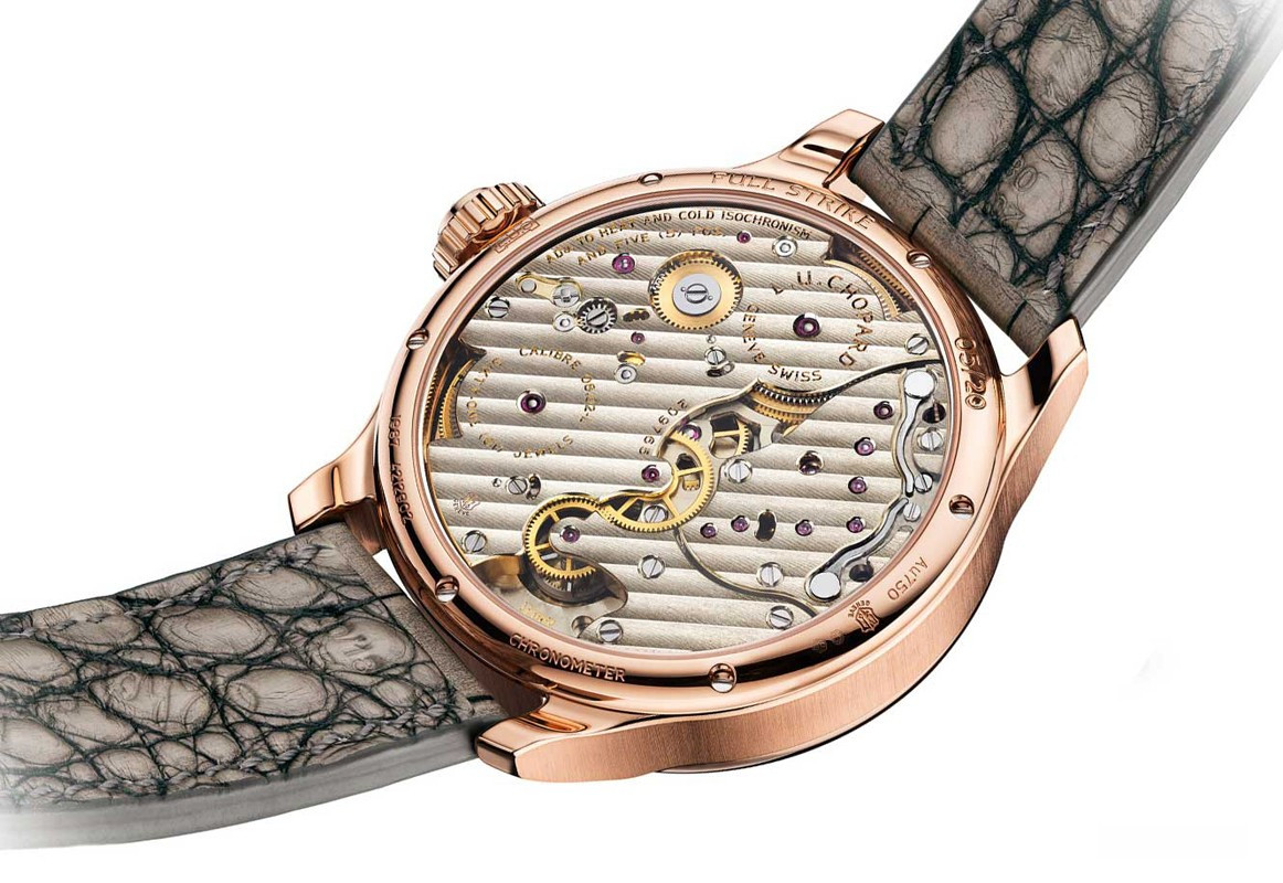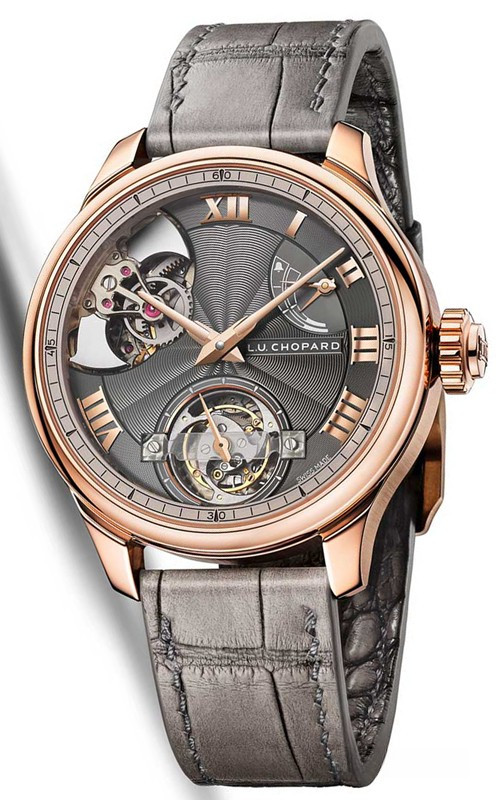 Часы Chopard L.U.C Strike Tourbillon представлены в корпусе из розового золота 18к размером 42.5 х 12.58 мм водонепроницаемостью 30 метров. Внутри корпуса установлен механизм с ручным заводом, Калибр L.U.C 08.02-L, обладающий запасом хода 50 часов. На сером гильошированном циферблате отображаются часы, минуты, секунды, турбийон, репетир. Часы поставляются на ремешке из кожи аллигатора с золотой застежкой. Серия ограничена - 20 шт.
