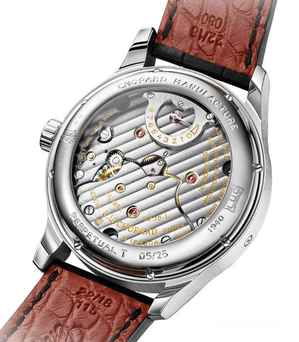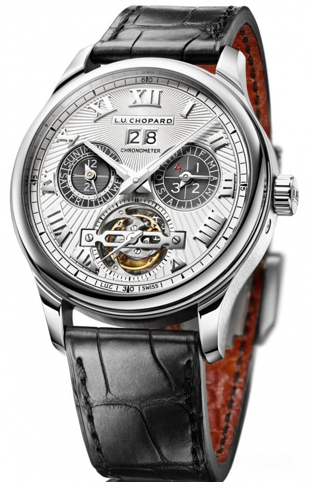 Chopard L.U.C Perpetual T – новая версия, выпущенная ограниченной серией из 25 единиц, от швейцарской часовой мануфактуры. В функционал модели входит вечный календарь, турбийон и впечатляющий запас хода. Модель представлена в круглом полированном корпусе из платины размером 43 х 14.9 мм. Водонепроницаемость корпуса до 30 метров. Серебристый циферблат гильоширован вручную. На его фоне роскошно смотрятся субциферблаты вечного календаря темно-серого цвета. Сапфировое стекло защищает циферблат от попадания пыли и влаги. Накладные римские цифры украшают циферблат, часовая и минутная стрелки покрыты SuperLuminova. Кроме индикации часов и минут на циферблате отображаются секунды при помощи стрелки, установленной на каретке турбийона. Двойная апертура даты находится в позиции 12 часов. Индикаторы дня/ночи и дня недели совмещены и находятся в позиции 9 часов. Цикл високосного года и месяц читаются на 3-х часах. Запас хода можно наблюдать на обратной стороне часов. Каретка турбийона расположена на 6-ти часах. Внутри корпуса деликатно установлен мануфактурный швейцарский механизм с ручным заводом LUC 02.15-L. Четыре барабана обеспечивают беспрецедентный запас хода 9 дней. Механизм официально сертифицирован COSC (Contrôle Officiel Suisse des Chronomètres) в качестве хронометра, отменно отделан и декорирован. Часы отмечены "Женевским клеймом". Модель комплектуется черным ремешком из кожи аллигатора с застежкой из 18-каратного белого золота.