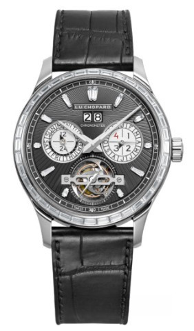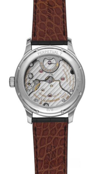 Chopard L.U.C Perpetual T представлены ограниченной серией 8 шт. В функционал модели входит вечный календарь, турбийон и впечатляющий запас хода. Модель представлена в круглом полированном корпусе из платины 950 размером 43 х 14.9 мм. Водонепроницаемость корпуса до 30 метров. Серый циферблат гильоширован вручную. На его фоне роскошно смотрятся субциферблаты вечного календаря. Сапфировое стекло защищает циферблат от попадания пыли и влаги. Накладные римские цифры украшают циферблат, часовая и минутная стрелки покрыты SuperLuminova. Кроме индикации часов и минут на циферблате отображаются секунды при помощи стрелки, установленной на каретке турбийона. Двойная апертура даты находится в позиции 12 часов. Индикаторы дня/ночи и дня недели совмещены и находятся в позиции 9 часов. Цикл високосного года и месяц читаются на 3-х часах. Запас хода можно наблюдать на обратной стороне часов. Каретка турбийона расположена на 6-ти часах. Внутри корпуса деликатно установлен мануфактурный швейцарский механизм с ручным заводом LUC 02.15-L. Четыре барабана обеспечивают беспрецедентный запас хода 9 дней. Механизм официально сертифицирован COSC (Contrôle Officiel Suisse des Chronomètres) в качестве хронометра, отменно отделан и декорирован. Часы отмечены "Женевским клеймом". Модель комплектуется ремешком из кожи аллигатора с застежкой из платины 950.