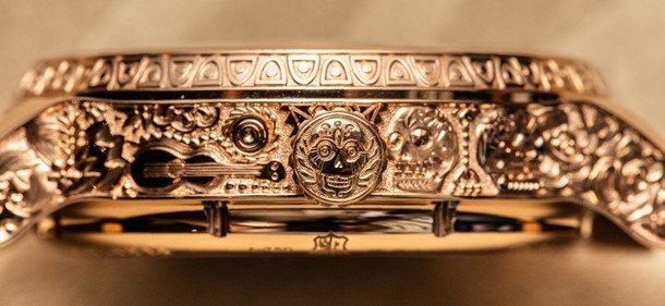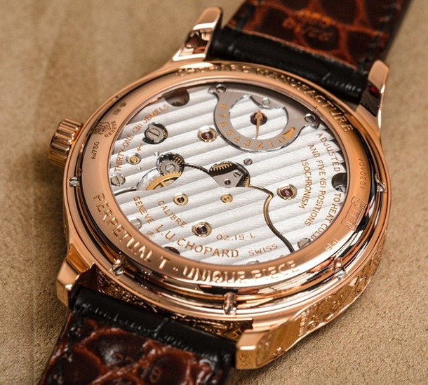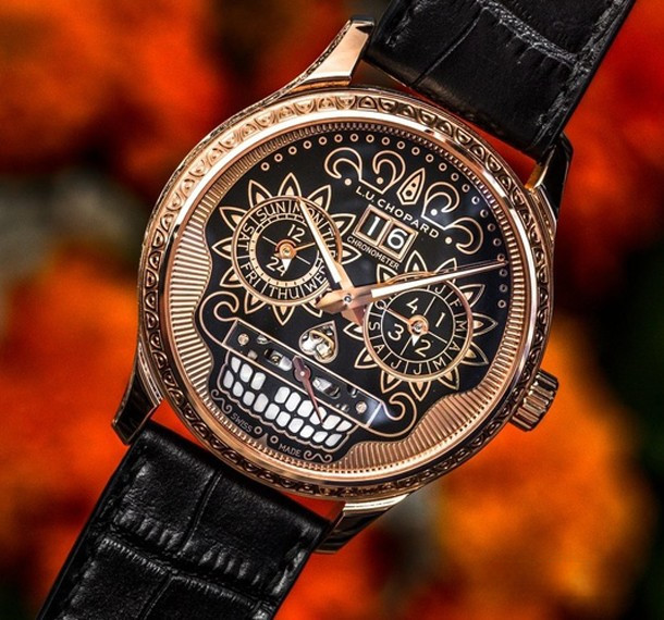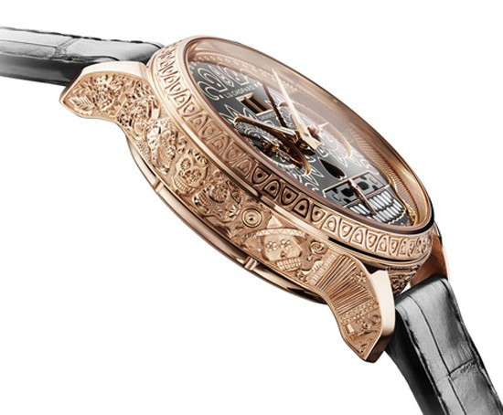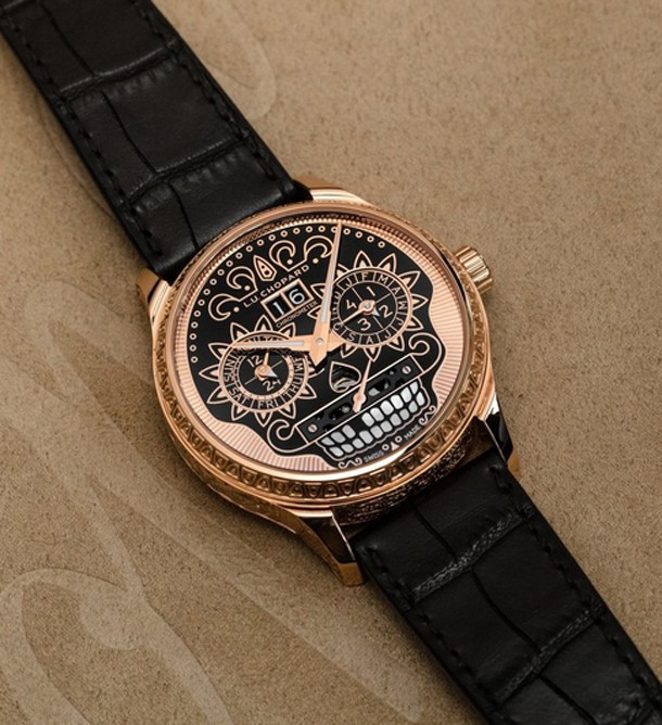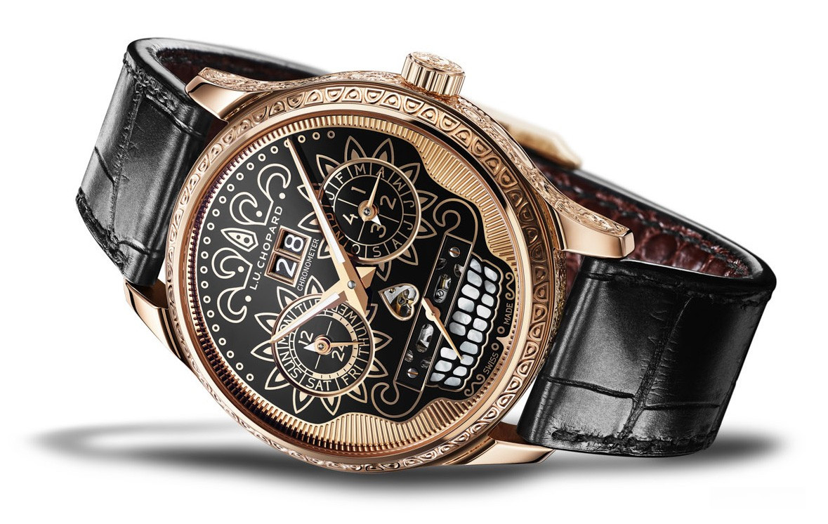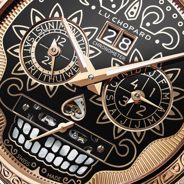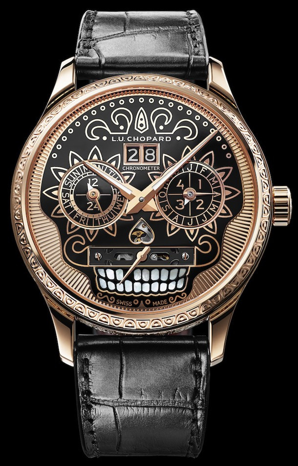 Chopard L.U.C Perpetual T выпущены ограниченной серией 1 шт. В функционал модели входит вечный календарь, турбийон и впечатляющий запас хода. Модель представлена в круглом полированном корпусе из розового золота 18к размером 43 х 15,02 мм. Водонепроницаемость корпуса до 30 метров. Черный циферблат с изображения черепа. На его фоне роскошно смотрятся субциферблаты вечного календаря. Сапфировое стекло защищает циферблат от попадания пыли и влаги. Часовая и минутная стрелки покрыты SuperLuminova. Кроме индикации часов и минут на циферблате отображаются секунды при помощи стрелки, установленной на каретке турбийона. Двойная апертура даты находится в позиции 12 часов. Индикаторы дня/ночи и дня недели совмещены и находятся в позиции 9 часов. Цикл високосного года и месяц читаются на 3-х часах. Запас хода можно наблюдать на обратной стороне часов. Каретка турбийона расположена на 6-ти часах. Внутри корпуса деликатно установлен мануфактурный швейцарский механизм с ручным заводом LUC 02.15-L. Четыре барабана обеспечивают беспрецедентный запас хода 9 дней. Механизм официально сертифицирован COSC (Contrôle Officiel Suisse des Chronomètres) в качестве хронометра, отменно отделан и декорирован. Часы отмечены "Женевским клеймом". Модель комплектуется черным ремешком из кожи аллигатора с застежкой из 18-каратного розового золота.