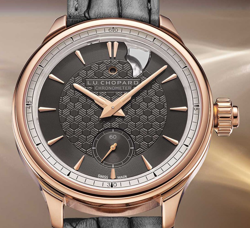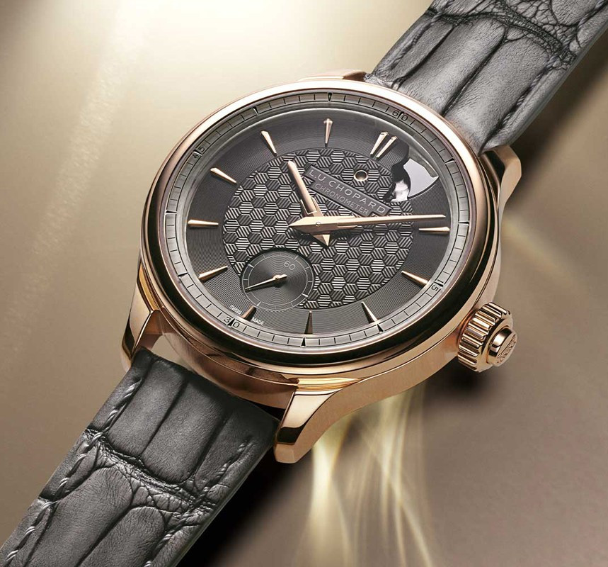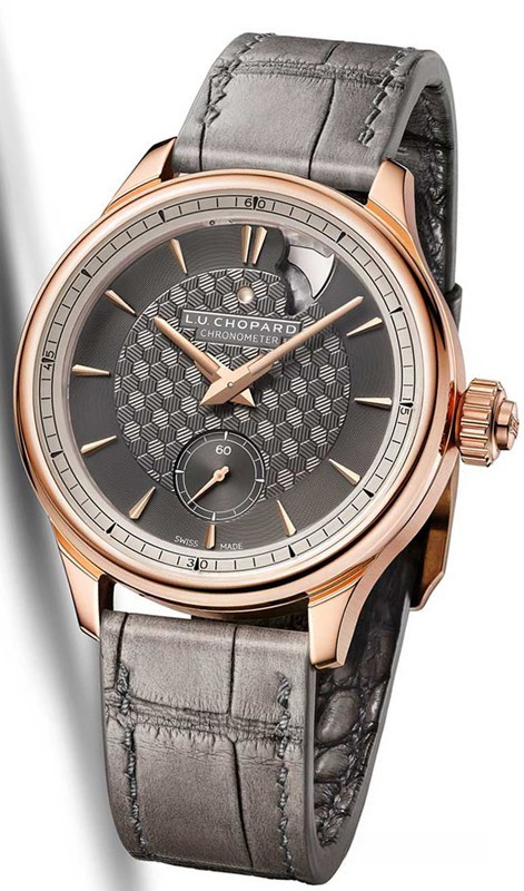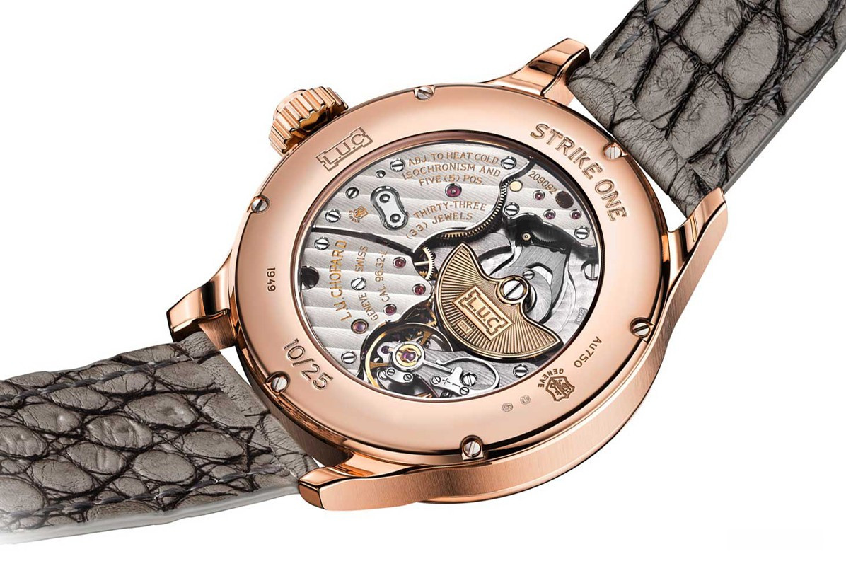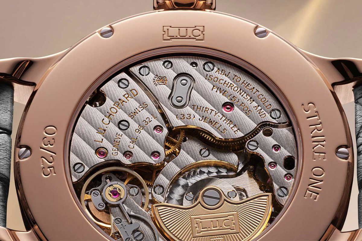 Часы Chopard L.U.C Strike One представлены в корпусе из розового золота 18к размером 40 х 9.86 мм водонепроницаемостью 50 метров. Внутри корпуса установлен автоматический механизм, Калибр L.U.C 96.32-L, обладающий запасом хода 65 часов. На сером гильошированном циферблате отображаются часы, минуты, секнды, репетир. Часы поставляются на ремешке из кожи аллигатора с золотой застежкой. Серия ограничена - 25 шт.