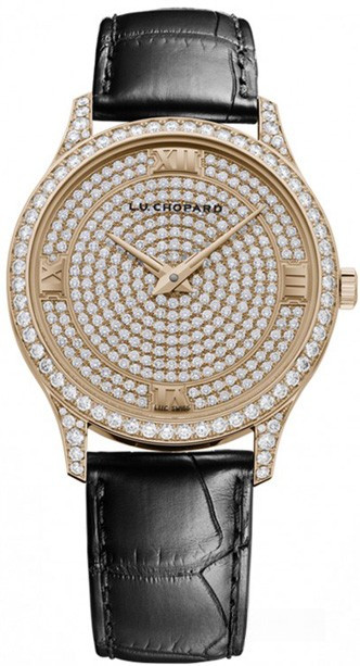 Часы L.U.C XP в корпусе из розового золота 750 пробы – это квинтэссенция сияющей элегантности. Толщина этой изысканной модели, выполненной в неброском и абсолютно вневременном стиле, не превышает 8,10 мм. Внешняя отделка покрытого бриллиантами циферблата дополнена позолоченными стрелками и часовыми метками. Корпус и безель также украшены искрящимися бриллиантами. В корпусе установлен видимый сквозь заднюю крышку механизм L.U.C Calibre 96.17-L с автоматическим заводом и 65-часовым запасом хода, высокая точность и надежность которого не подлежат сомнению.