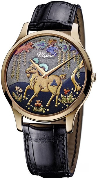 Провозглашенный «живым национальным достоянием» Японии художник Кииширо Масумура создал для Chopard этот уникальный циферблат в лаковой технике уруси и маки-е. Величественное произведение искусства, соединившее в себе старинные декоративные приемы с высочайшими достижениями швейцарского часового дела, изображает знак козы китайского гороскопа. Оно великолепно представлено в изящном корпусе ультратонких часов L.U.C XP из белого золота 750 пробы с автоматическим часовым механизмом L.U.C 96.17-L.