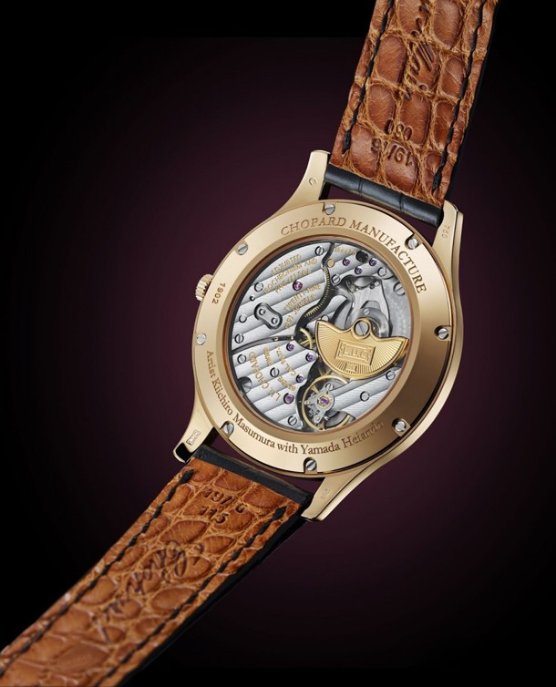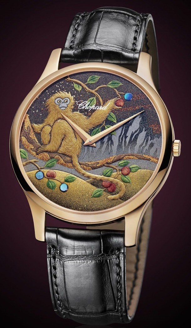 Швейцарская часовая мануфактура Chopard выпустила новую модель L.U.C XP Urushi "Year of the Monkey" (Ref. 161902-5061) в честь года Обезьяны по китайскому календарю, который начнется 8 февраля 2016 года. Главной изюминкой модели является ее красочный циферблат, выполненный в технике лакирования уруши (Urushi). На нем изображена обезьяна, собирающая персики. Циферблат отличается минимализмом, на нем нет часовых индексов и цифр. Часовая и минутная стрелки выполнены в стиле Dauphine из золота и расположены в центре циферблата. Новинка имеет круглый полированный корпус, изготовленный из 18-каратного розового золота, диаметром 39.5 мм, толщиной 6.8 мм, водонепроницаемый до 30 метров. Сапфировое стекло с двойным антибликовым покрытием установлено на передней стороне часового корпуса, а также с обратной его стороны. Внутри корпуса установлен мануфактурный швейцарский автоматический механизм Chopard L.U.C. 96.17L, вручную отрегулированным в пяти положениях, диаметром 27.4 мм, толщиной .,3 мм, на 29 камнях, с плоской балансовой пружиной, балансовой частотой 28 800 полуколебаний в час, двумя заводными барабанами. Запас хода новинки составляет 65 часов. Ротор автоподзавода изготовлен з 22-каратного золота. Калибр отменно декорирован. В частности, посредством нанесения женевских волн и циркулярного гранения. Часы комплектуются черным ремешком из кожи аллигатора с застежкой из розового золота 18к.