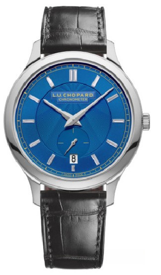Часы Chopard L.U.C XP XPS 1860 Azur представлены в корпусе из белого золота 18к размером 40 мм водонепроницаемостью 30 метров. Внутри корпуса установлен автоматический механизм, Калибр L.U.C 96.01-L, обладающий запасом хода 65 часов. На синем циферблате отображаются часы, минуты, секунды, дата. Часы комплектуются ремешком из кожи аллигатора с вставкой из белого золота 18к. Серия ограничена - 10 шт.