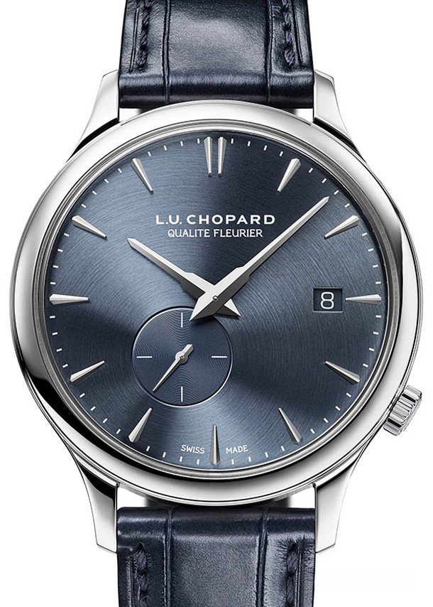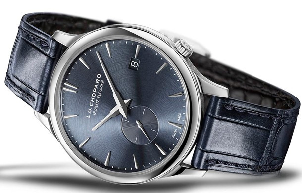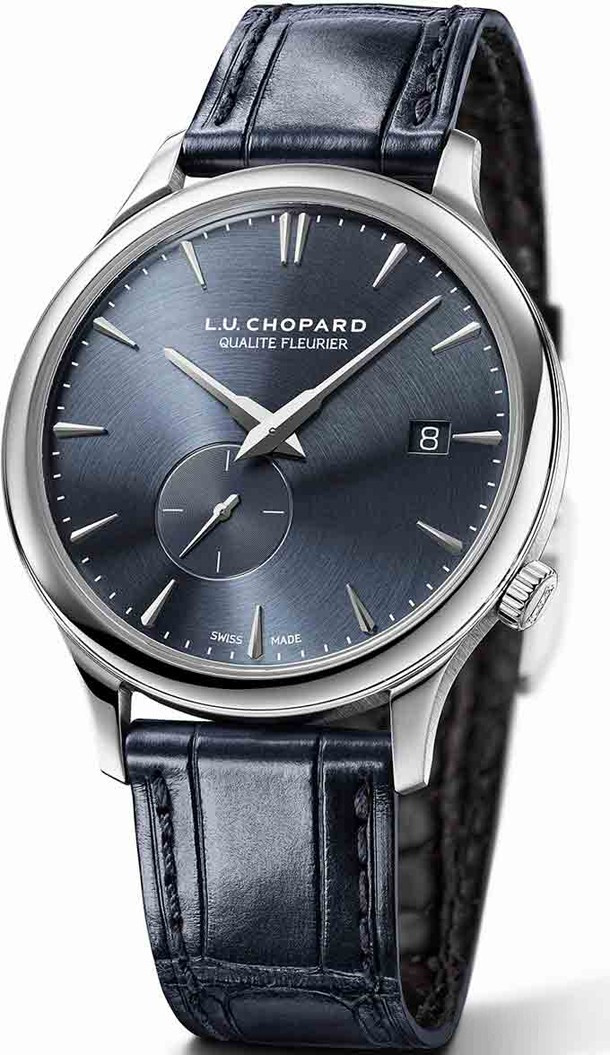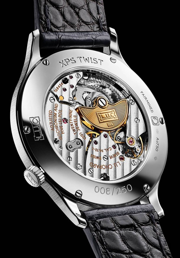 Часы Chopard L.U.C XPS Twist QF выпущены ограниченной серией 250 штук, корпус имеет смещенную к 4-м часам коронку и дополнительную маленькую секундную стрелку на 7-ми часах. Круглый корпус диаметром 40 мм изготовлен из белого золота 18к. Циферблат синего цвета, где маленький индикатор с секундной стрелкой является визуальной фокусной точкой, что подчеркивается круглым сатинированным мотивом, расходящимся концентрическими кругами от него. Надпись на циферблате Qualité Fleurier под именем L.U.C подтверждает высокое качество часов. Калибр 96.26-L смещен на 30 градусов. Автоматический механизм комплектуется гравированным 22-каратным золотым микротором, высокая инерция которого обеспечивает оптимальную эффективность. Калибр 96.26-L питает два барабана на основе запатентованной конструкции Twin от Chopard. Вместе они гарантируют 65 часов работы, что примечательно для ультратонких часов. Часы дополнены матовым синим ремешком из кожи аллигатора с застежкой из белого золота 18к. Водонепроницаемость корпуса составляет 30 метров