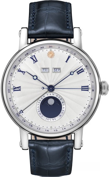 Круглый корпус новинки, изготовленный из нержавеющей стали, диаметром 44 мм. Рифленая заводная головка, выполненная в луковицеобразной форме, расположена на 3 часах. Сапфировое стекло защищает полностью гильошированный циферблат с накладными синими римскими цифрами и с круглыми часовыми точками, покрытыми, как и часовая и минутная стрелки, люминесцентным составом светло-голубого цвета. На 12 часах имеется накладное золотое изображение солнца. Модель оснащена автоматическим механизмом Christiaan van der Klaauw CVDK7760, с функциями индикации часов, минут, секунд (посредством соответствующих центральных стрелок), даты (посредством специальной центральной стрелки с треугольным наконечником синего цвета, на круглой шкале, расположенной на фланце циферблата и размеченной арабскими цифрами), дня недели и месяца (посредством соответствующих буквенных указателей в прямоугольных апертурах, расположенных на 11 и 13 часах), а также фаз Луны (посредством соответствующего указателя, расположенного на 6 часах). Поставляется на синем ремешке из кожи аллигатора с застежкой из нержавеющей стали.