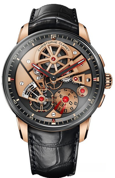 Часы Christophe Claret Maestro Date представлены в корпусе из розового золота 18к размером 42 х 16.06 мм и водонепроницаемостью 30 метров. Внутри корпуса установлен механизм с ручным заводом, Калибр DMC16 с запасом хода 7 дней. На золотистом с черным циферблате отображаются часы, минуты, дата. Часы поставляются на ремешке из кожи аллигатора с вставкой из розового золота 18к. Серия ограничена - 88 шт.