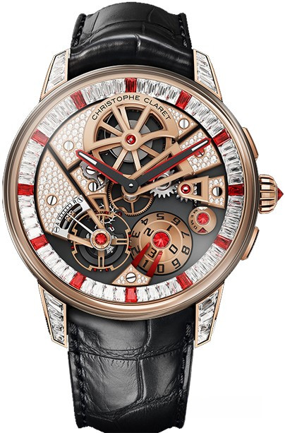Часы Christophe Claret Maestro Date представлены в корпусе из розового золота 18к размером 42 х 16.06 мм и водонепроницаемостью 30 метров. Внутри корпуса установлен механизм с ручным заводом, Калибр DMC16 с запасом хода 7 дней. На золотистом с черным циферблате с белыми бриллиантами отображаются часы, минуты, дата. Часы поставляются на ремешке из кожи аллигатора с вставкой из розового золота 18к. Корпус инкрустирован белыми багетными бриллиантами. Серия ограничена - 28 шт.