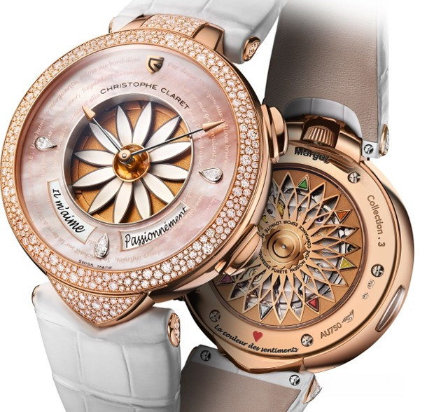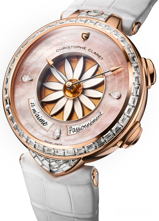 Часы Margot в корпусе из розового золота 18к оснащены автоматическим механизмом EMT17 с запасом хода 72 часа. Функции часов: часовая и минутная стрелки. Указатели: 12 лепестков «Любит ... не любит», предназначенных для того, чтобы их «обрывать»; «Сила чувств» в окошке около метки «5 часов»: un peu (немного), beaucoup (сильно), passionnément (страстно), à la folie (сумасшедшая любовь) и pas du tout (вовсе не любит). Кнопка в положении «2 часа» «обрывает» 1 или 2 лепестка, передвигая при этом индикатор «Сила чувств» вперёд на один сегмент. Удар гонга после каждого нажатия кнопки в положении «2 часа», молоточек открыт для обозрения («8 часов»). Кнопка сброса указателя «Любит ... не любит» в положении «4 часа»: все лепестки заново появляются, а в окошке указателя «Сила чувств» около метки «5 часов» появляется пустое поле.