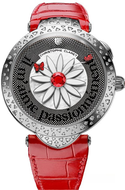 Часы Christophe Claret Marguerite представлены в корпусе из белого золота 18к размером 42.5 х 12.07 мм и водонепроницаемостью до 30 метров. Внутри корпуса установлен автоматический механизм MT115 с запасом хода 72 часа. На белом жемчужном циферблате отображаются часы, минуты. Часы комплектуются ремешком из кожи аллигатора с вставкой из белого золота 18к. Корпус часов инкрустирован белыми бриллиантами. Часы выпущены ограниченной серией 30 шт. На циферблате размещена романтическая надпись. На задней стороне корпуса можно играть в игру "любит-не любит" при помощи ротора.