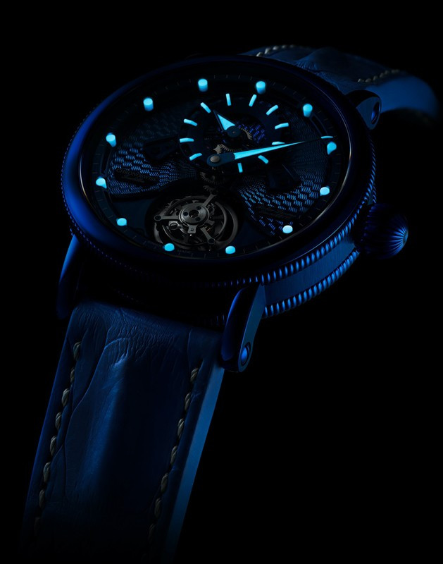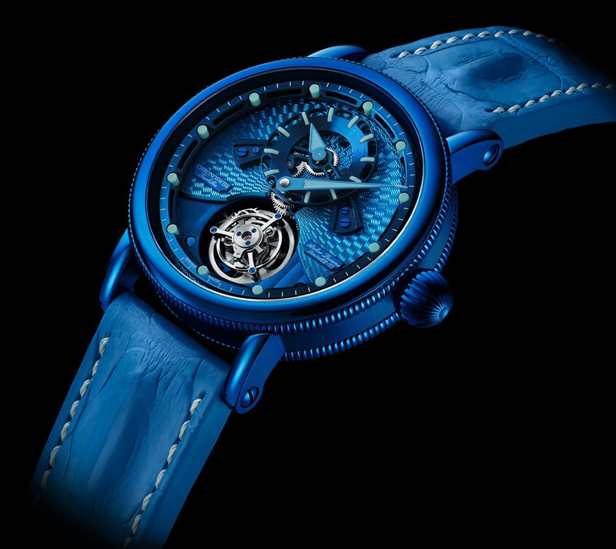 Часы Chronoswiss Open Gear Tourbillon представлены в корпусе из нержавеющей стали с покрытием CVD размером 44 х 13.1 мм водонепроницаемостью 100 метров. Внутри корпуса установлен механизм с ручным заводом, Калибр C.303, обладающим запасом хода 60 часов. На синем циферблате отображаются часы, минуты, турбийон. Часы поставляются на ремешке из кожи аллигатора с вставкой из нержавеющей стали. Серия ограничена - 15 шт.