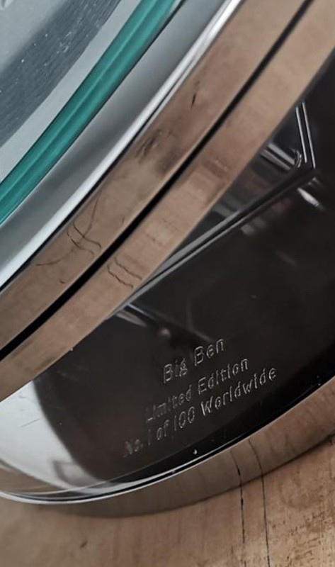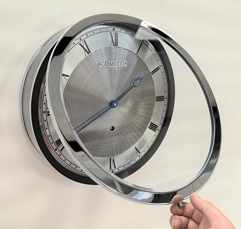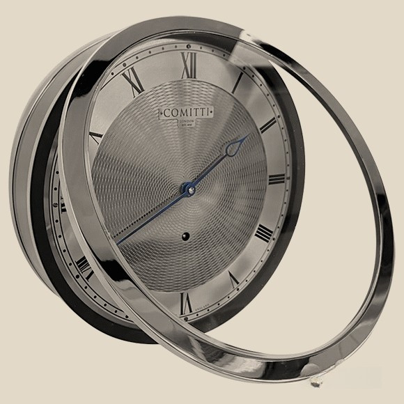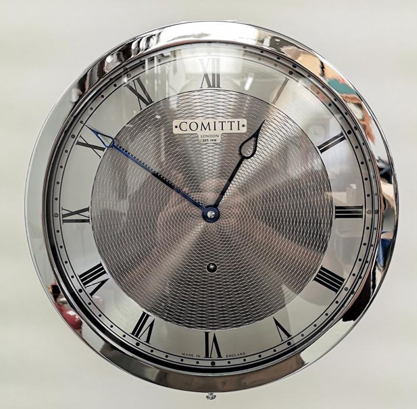 Настенные часы Comitti London Est.1850 Big Ben. Механизм с ручным заводом, запас хода 8 дней. Лимитированный выпуск 100 штук. На серебристом гильошированном циферблате отображаются часы и минуты.