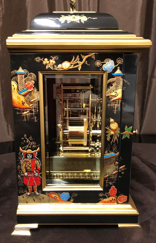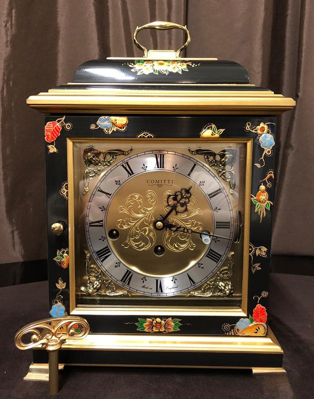 Классические каминные часы Comitti London Est.1850 Samurai с тройным курантом. Черный лакированный корпус с глянцевой отделкой, ручная роспись, эксклюзивные произведения самурая Chinoisere на сусальном золоте. Ограниченная серия 50 штук по всему миру, подписана художником. Высота 29 см. Ширина 21 см. Глубина 16 см. Вес 5,5 кг. Часы упакованы в коробку из красного дерева. Производство Англия.