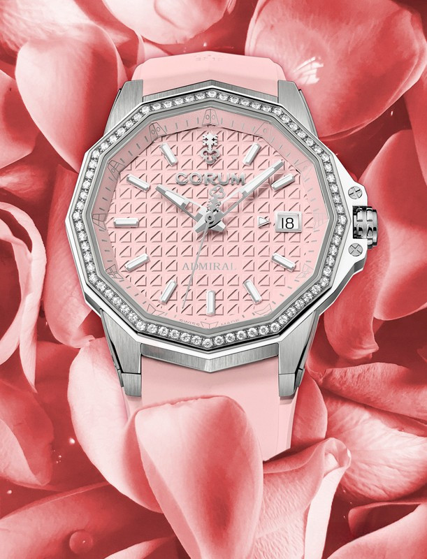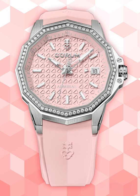 Часы Corum Admiral`s Cup Legend 38 выпущены в корпусе из титана, размером 38 х 8.95 мм и водонепроницаемостью 100 м. Внутри корпуса установлен автоматический Калибр CO 082 с запасом хода 42 часа. На розовом гильошированном циферблате отображаются часы, минуты, секунды, дата. Часы комплектуются каучуковым ремешком с вставкой из титана. Безель из белых бриллиантов. Серия ограничена - 150 шт.