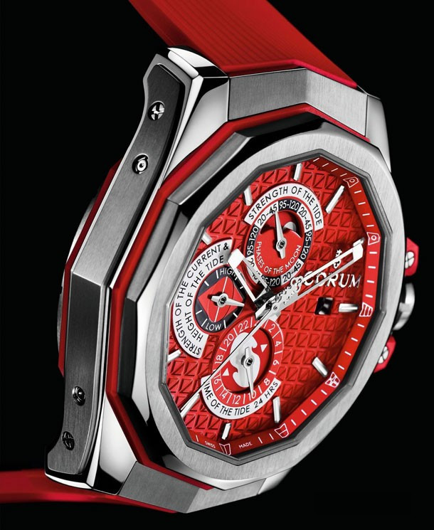 Компания Corum во время базельской выставки показала новые часы, созданные на базе сложнейшего механизма, рассчитывающего время приливов и отливов. Отдавая дань морской тематике, марка сделала их циферблат и ремешок красным. Корпус выполнен из титана, поэтому массивные 45-миллиметровые часы не слишком отягощают запястье. «Прочитать» циферблат обычному человеку будет не под силу, поэтому даем пояснение. У отметки «12 часов» расположен индикатор фаз Луны, позволяющий следить за сменой приливов и отливов. Амплитуда приливов и отливов обозначается стрелкой на этом счетчике. Индикатор на «6 часах» показывает время двух приливов и отливов, ожидаемых в ближайшие 24 часа. Чтобы узнать поднимается вода или уходит, нужно посмотреть на счетчик у отметки «9 часов», который подсказывает также и силу течения. Если стрелка счетчика находится на красной горизонтальной отметке, это означает, что интенсивность прилива или отлива достигла своего максимума. Положение стрелки вровень с белой вертикальной отметкой подсказывает, что течение максимально ослабло. В производстве механизма для Admiral’s Cup AC-One 45 Tides (создан в 1993 году) компании Corum помогали сотрудники Женевской астрономической обсерватории и Службы океанографических и гидрографических исследований французского города Брест. Калибр CO 082 автоматический, запас хода у него составляет 42 часам. Водойстойкость корпуса — 300 метров.