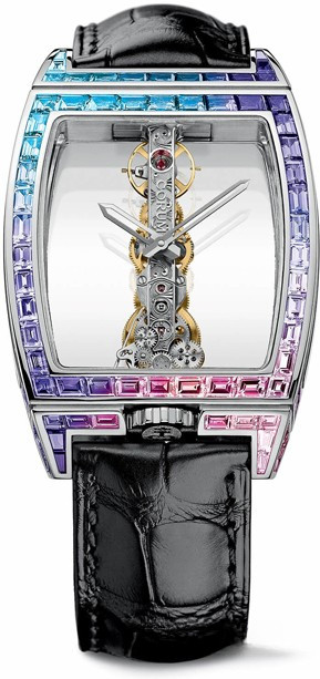 Часы Corum Golden Bridge представлены в корпусе из белого золота 18к размером 34 х 51 мм и водонепроницаемостью 30 метров. Внутри корпуса установлен механизм с ручным заводом, Калибр СО 113, обладающий запасом хода 40 часов. На циферблате отображаются часы, минуты. Часы поставляются на ремешке из кожи аллигатора с вставкой из белого золота 18к. Корпус инкрустирован разноцветными багетными сапфирами.