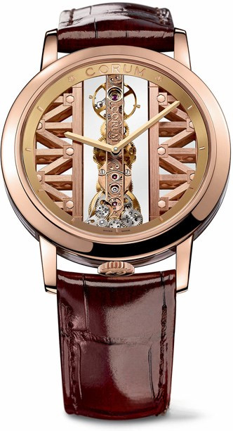 Круглый полированный корпус часов, изготовленный из 18-каратного розового золота, диаметром 43 мм. Рифленая заводная головка расположена на 6 часах. Сапфировое стекло установлено на передней стороне часового корпуса и на его задней крышке. В центральной части вертикально размещен часовой механизм, а справа и слева от него - решетчатые структуры, напоминающие перекладины моста Золотые ворота. Модель оснащена швейцарским калибром с ручным заводом Corum CO113, сконструированным знаменитым мастером-часовщиком Винсентом Калабрезе (Vincent Calabrese), с балансом с переменной инерцией, с балансовой частотой 28800 полуколебаний в час (4 гц), 40-часовым запасом хода, функциями индикации часов и минут (посредством соответствующих центральных стрелок). Поставляется на ремешке из кожи аллигатора с застежкой из 18-каратного розового золота.