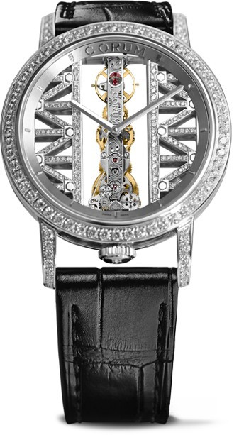 Круглый полированный корпус новинки, изготовленный из 18-каратного белого золота, диаметром 43 мм. Рифленая заводная головка расположена на 6 часах. Сапфировое стекло установлено на передней стороне часового корпуса и на его задней крышке. В центральной части вертикально размещен часовой механизм, а справа и слева от него - решетчатые структуры, напоминающие перекладины моста Золотые ворота. Модель оснащена швейцарским калибром с ручным заводом Corum CO113, сконструированным знаменитым мастером-часовщиком Винсентом Калабрезе (Vincent Calabrese), с балансом с переменной инерцией, с балансовой частотой 28800 полуколебаний в час (4 гц), 40-часовым запасом хода, функциями индикации часов и минут (посредством соответствующих центральных стрелок). Поставляется на черном ремешке из кожи аллигатора с застежкой из 18-каратного белого золота. Корпус и циферблат часов инкрустированы белыми бриллиантами.