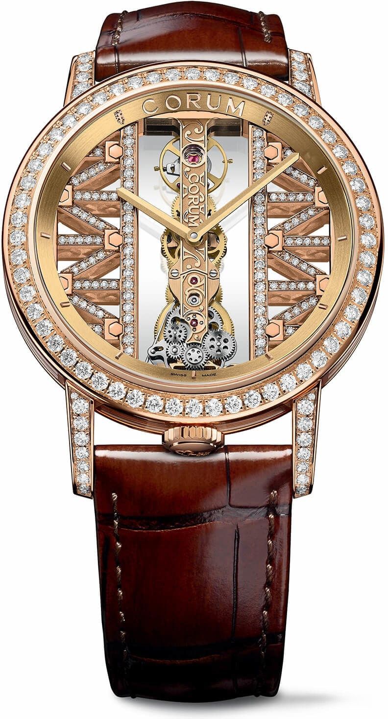 Круглый полированный корпус часов, изготовленный из 18-каратного розового золота, диаметром 43 мм. Рифленая заводная головка расположена на 6 часах. Сапфировое стекло установлено на передней стороне часового корпуса и на его задней крышке. В центральной части вертикально размещен часовой механизм, а справа и слева от него - решетчатые структуры, напоминающие перекладины моста Золотые ворота. Модель оснащена швейцарским калибром с ручным заводом Corum CO113, сконструированным знаменитым мастером-часовщиком Винсентом Калабрезе (Vincent Calabrese), с балансом с переменной инерцией, с балансовой частотой 28800 полуколебаний в час (4 гц), 40-часовым запасом хода, функциями индикации часов и минут (посредством соответствующих центральных стрелок). Поставляется на ремешке из кожи аллигатора с застежкой из 18-каратного розового золота. Корпус инкрустирован белыми бриллиантами.