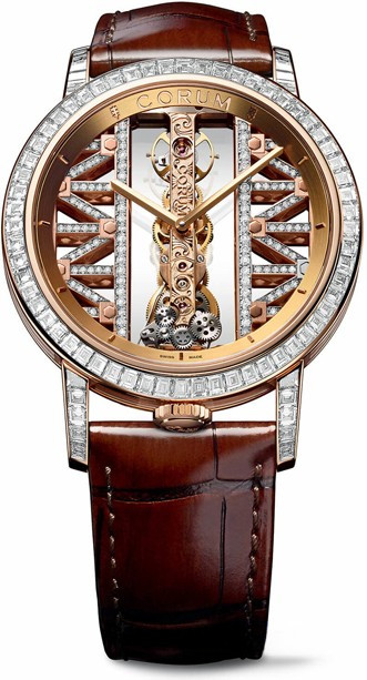 Круглый полированный корпус часов, изготовленный из 18-каратного розового золота, диаметром 43 мм. Рифленая заводная головка расположена на 6 часах. Сапфировое стекло установлено на передней стороне часового корпуса и на его задней крышке. В центральной части вертикально размещен часовой механизм, а справа и слева от него - решетчатые структуры, напоминающие перекладины моста Золотые ворота. Модель оснащена швейцарским калибром с ручным заводом Corum CO113, сконструированным знаменитым мастером-часовщиком Винсентом Калабрезе (Vincent Calabrese), с балансом с переменной инерцией, с балансовой частотой 28800 полуколебаний в час (4 гц), 40-часовым запасом хода, функциями индикации часов и минут (посредством соответствующих центральных стрелок). Поставляется на ремешке из кожи аллигатора с застежкой из 18-каратного розового золота. Корпус инкрустирован белыми багетными бриллиантами.