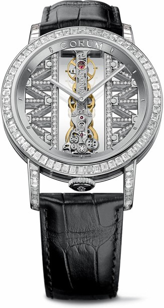 Круглый полированный корпус часов, изготовленный из 18-каратного белого золота, диаметром 43 мм. Рифленая заводная головка расположена на 6 часах. Сапфировое стекло установлено на передней стороне часового корпуса и на его задней крышке. В центральной части вертикально размещен часовой механизм, а справа и слева от него - решетчатые структуры, напоминающие перекладины моста Золотые ворота. Модель оснащена швейцарским калибром с ручным заводом Corum CO113, сконструированным знаменитым мастером-часовщиком Винсентом Калабрезе (Vincent Calabrese), с балансом с переменной инерцией, с балансовой частотой 28800 полуколебаний в час (4 гц), 40-часовым запасом хода, функциями индикации часов и минут (посредством соответствующих центральных стрелок). Поставляется на ремешке из кожи аллигатора с застежкой из 18-каратного белого золота. Корпус инкрустирован белыми багетными бриллиантами.