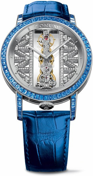Круглый полированный корпус часов, изготовленный из 18-каратного белого золота, диаметром 43 мм. Рифленая заводная головка расположена на 6 часах. Сапфировое стекло установлено на передней стороне часового корпуса и на его задней крышке. В центральной части вертикально размещен часовой механизм, а справа и слева от него - решетчатые структуры, напоминающие перекладины моста Золотые ворота. Модель оснащена швейцарским калибром с ручным заводом Corum CO113, сконструированным знаменитым мастером-часовщиком Винсентом Калабрезе (Vincent Calabrese), с балансом с переменной инерцией, с балансовой частотой 28800 полуколебаний в час (4 гц), 40-часовым запасом хода, функциями индикации часов и минут (посредством соответствующих центральных стрелок). Поставляется на ремешке из кожи аллигатора с застежкой из 18-каратного белого золота. Корпус инкрустирован синими багетными сапфирами.