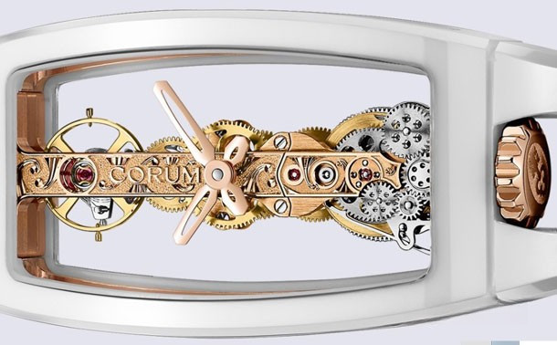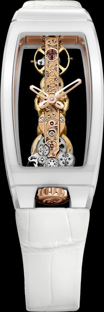 Когда Corum выпустили модель Golden Bridge в 1980 году, они, вероятно, даже не представляли, что она станет одним из стрежней бренда и, в конечном счете, иконой изысканного швейцарского часового искусства. Тем не менее, в 2015 году Corum празднует 35-летие от изобретения этого мифического часового механизма Golden Bridge. Уникальный Калибр Golden Bridge состоит из 140 компонентов, расположенных в вытянутом прямоугольнике длиной 33 мм, 3 мм в ширину и менее чем 5 мм в толщину – настоящий шедевр микромеханики и оригинального дизайна. Corum Miss Golden Bridge изготовлены из белой керамики. Часы обладают размерами 21 х 43 х 11.19 мм, комплектуются Калибром Corum CO 113 с ручным заводом (40 часов запаса хода, 4 Гц / 28 800 пк/час).