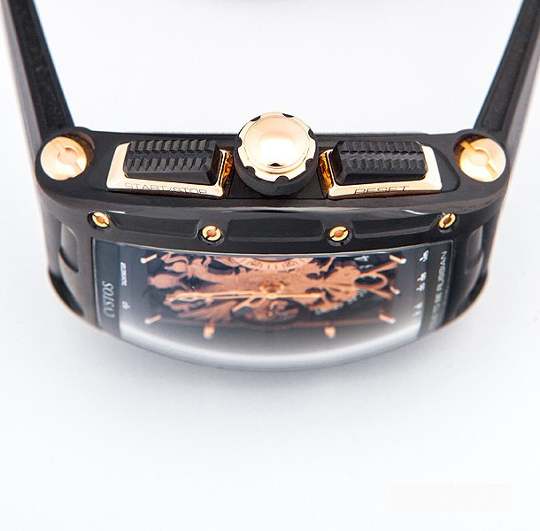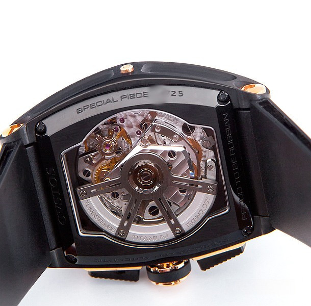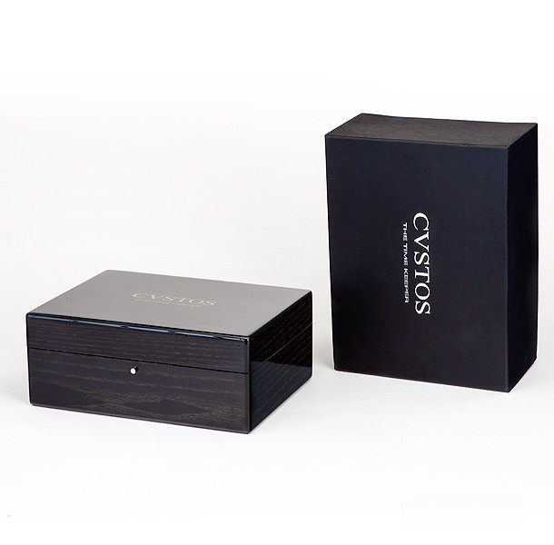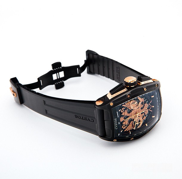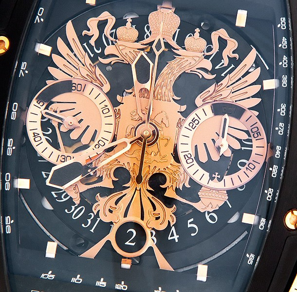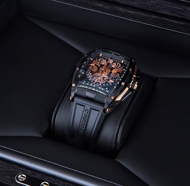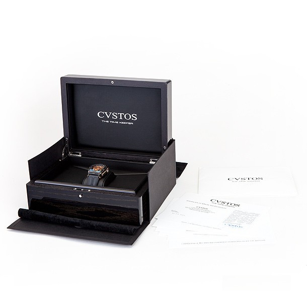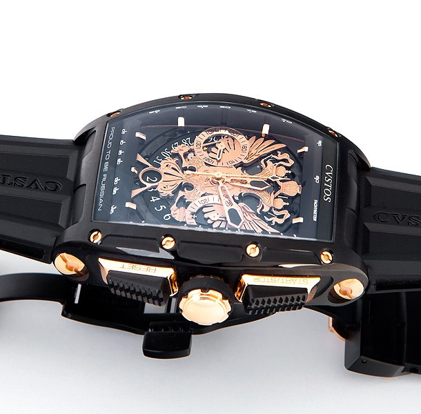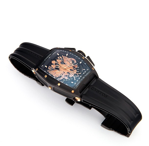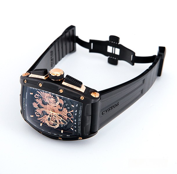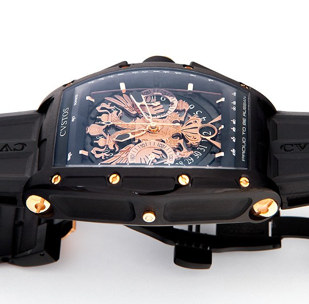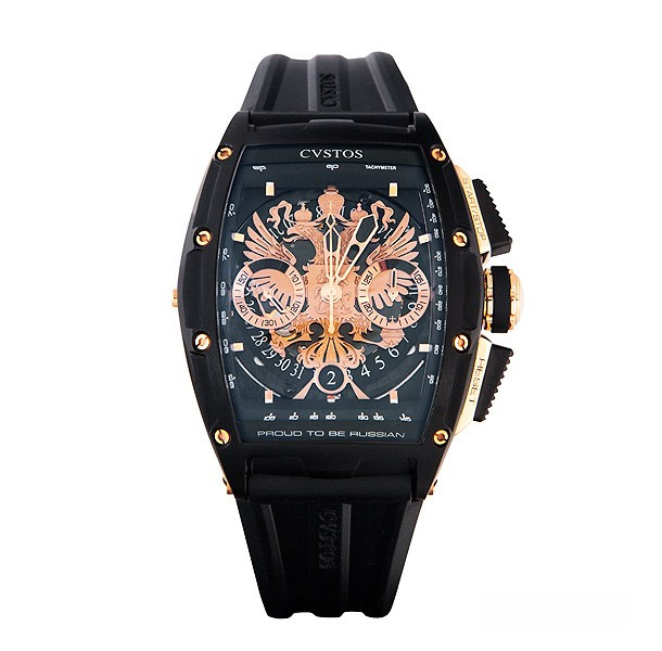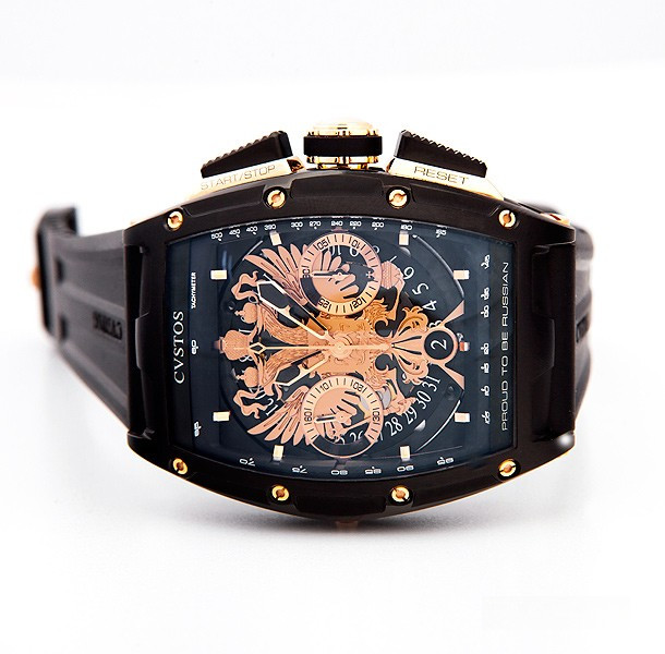 Cvstos Challenge Eagle of Russia - специальная серия часов, выпущенная лимитом 25 штук. На черном с золотистым циферблате изображен двуглавый орел - герб России. Корпус часов изготовлен титана с покрытием PVD и розового золота 18к. Размер составляет 50 х 42 мм. Водонепроницаемость корпуса до 100 метров. Внутри корпуса установлен автоматический Калибр 557 с запасом хода 48 часов и функциями часов, минут, секунд, даты и тахиметра. Высокоточный механизм усложнен функцией хронографа. Часы комплектуются каучуковым ремешком с титановой вставкой.