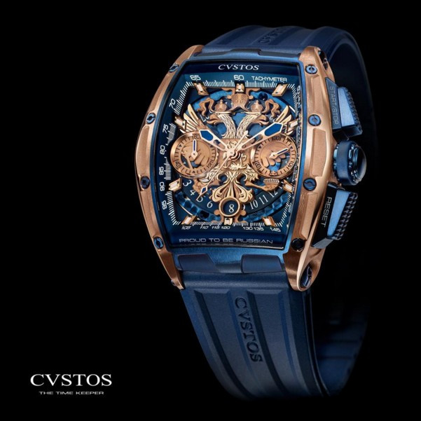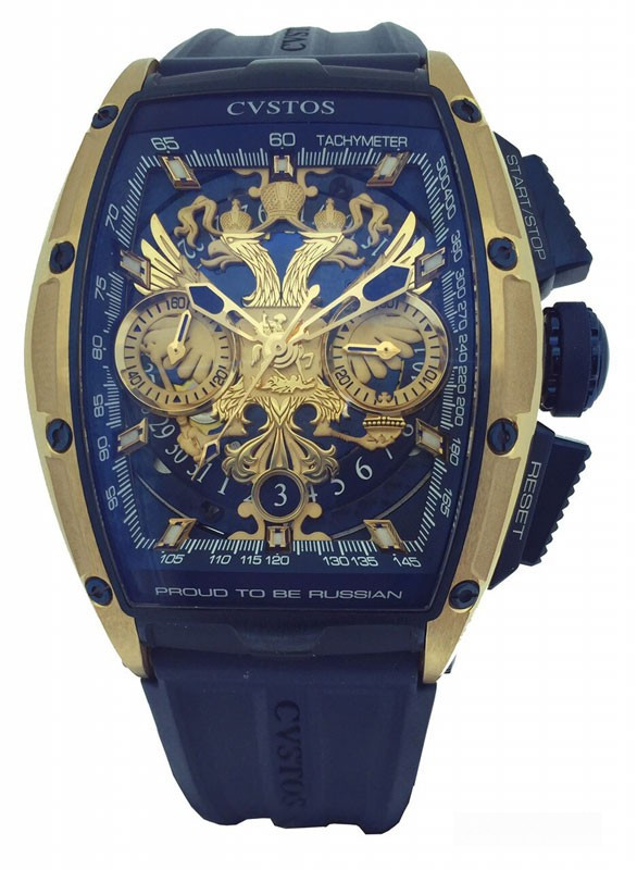 Cvstos Challenge Eagle chrono Depardieu LE - специальная серия часов, выпущенная лимитом 20 штук. На синем с золотистым циферблате изображен двуглавый орел - герб России. Корпус часов изготовлен из розового золота 18к и нержавеющей стали с покрытием PVD. Размер составляет 53.7 х 41 х 13.35 мм. Водонепроницаемость корпуса до 100 метров. Внутри корпуса установлен автоматический Калибр CVS350 с запасом хода 42 часа и функциями часов, минут, секунд, даты и тахиметра. Часы комплектуются каучуковым ремешком с вставкой из нержавеющей стали.