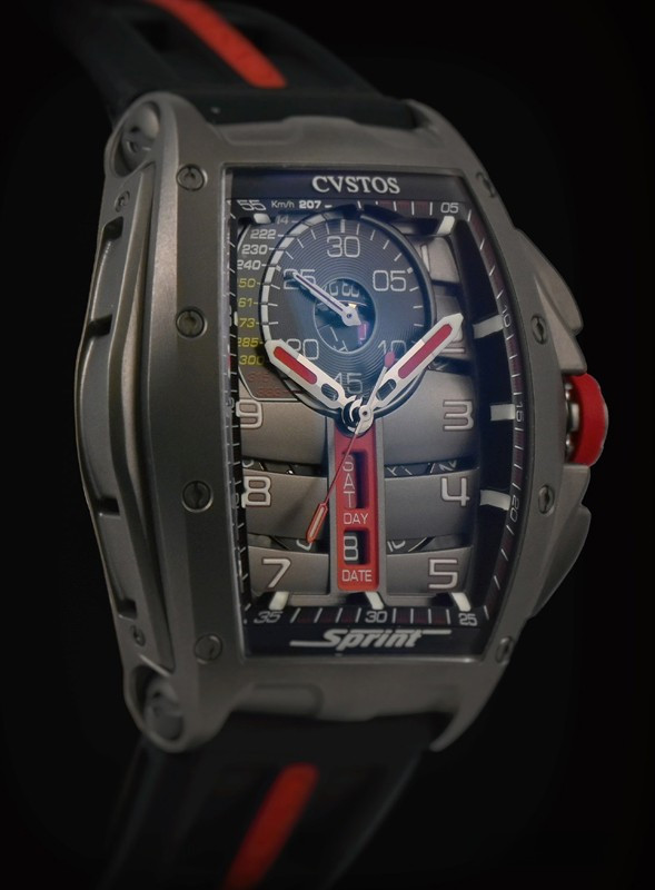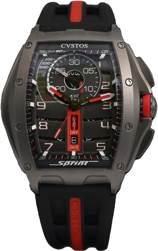 Часы Cvstos Challenge Chrono Sprint представлены в корпусе из титана размером 53.7 x 41 мм водонепроницаемостью 100 метров. Внутри корпуса установлен автоматический механизм, Калибр CVS556 SPRT, обладающий запасом хода 48 часов. На черном циферблате отображаются часы, минуты, секунды, дата, день недели. Часы поставляются на каучуковом ремешке с титановой застежкой. Серия огрничена - 30 шт.