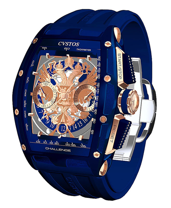 Challenge Russia Blue Edition - швейцарские наручные часы Cvstos, несмотря на молодость марки, имеют за собой серьезные традиции. У них узнаваемый дизайн, выполненный Антонио Терранове. Сегодня компания представляет новую модель Challenge Russia Blue Edition, сочетающей в себе мир яхт и морской стихии, роскошную жизнь на Средиземноморье и скорость попутного ветра. Часы Challenge Russia Blue Edition являются воплощением элегантности и дерзкого спортивного характера. Модель посвящена Гербу Российской федерации и выпущена ограниченной серией 20 экземпляров. Корпус модели Challenge Russia Blue Edition выполнен из нержавеющей стали с синим покрытием, заводная головка из розового золота. Защищает циферблат сапфировое стекло с двойным антибликовым покрытием. На циферблате двуглавый орел из розового золота - символ России. Водонепроницаемость – 100 метров. Часы оборудованы автоматическим Калибром с 42-часовым запасом хода, на 21 драгоценном камне с частотой полуколебаний в 28800. Центральные стрелки часов, минут и секунд покрыты люминесцентным составом. Поставляется новинка на каучуковом темно-синем ремешке.