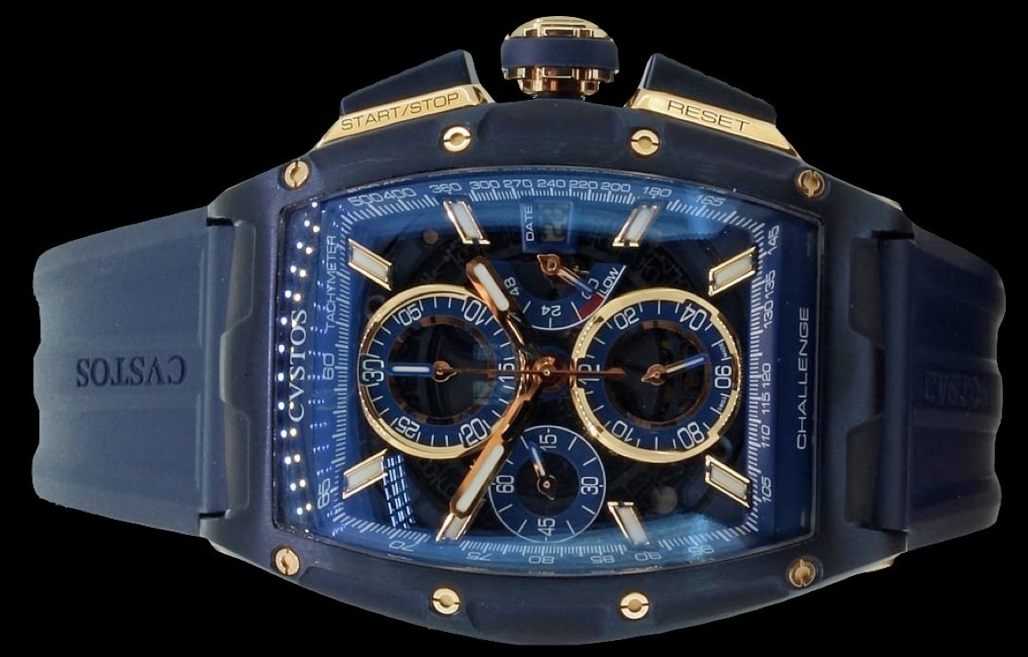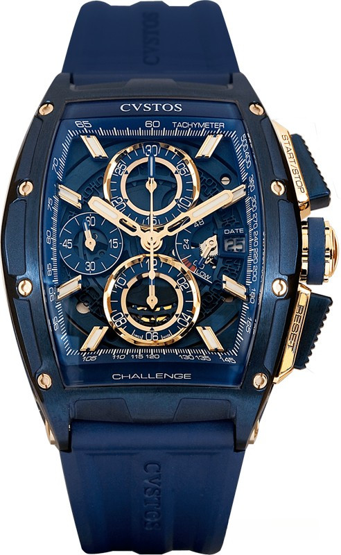 Часы представлены в корпусе из розового золота 18к и нержавеющей стали с покрытием PVD размером 45 х 59 мм. Комплектуются каучуковым ремешком с вставкой из нержавеющей стали. Циферблат скелетированный. Скелетонизированный круглый диск с набором чисел, в окошке на 3 часах показывает дату. По соседству занял место ретроградный индикатор запаса хода. В положении 12-ти часов разместился 30-минутный счетчик хронографа, а на 6 часах - таймер, выполняющий учет времени. Секундомеру в целях удобства считывания показаний было отведено место на 9-ти часах. Часовой механизм автоматический, Калибр CVSTOS 577, на 25 рубинах. Балансовая частота составляет 28 800 п/ч, запас хода - 42 часа.
