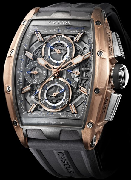Часы представлены в корпусе из титана с покрытием PVD и розового золота 18к размером 53.7 х 41 мм. Комплектуются каучуковым ремешком с титановой вставкой. Циферблат скелетированный. Скелетонизированный круглый диск с набором чисел, в окошке на 3 часах показывает дату. По соседству занял место ретроградный индикатор запаса хода. Часовые индексы, стрелки и кольца на дополнительных счетчиках выполнены из розового золота, а их внутренняя часть заполнена светящимся люминесцентным составом. В положении 12-ти часов разместился 30-минутный счетчик хронографа, а на 6 часах - таймер, выполняющий учет времени. Секундомеру в целях удобства считывания показаний было отведено место на 9-ти часах. Часовой механизм автоматический, Калибр CVSTOS 577, на 25 рубинах. Балансовая частота составляет 28 800 п/ч, запас хода - 42 часа.