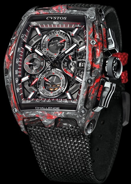Часы представлены в корпусе из карбона размером 53.7 х 41 х 13.35 мм. Комплектуются текстильным ремешком с вставкой из титана. Циферблат скелетированный. Скелетонизированный круглый диск с набором чисел, в окошке на 3 часах показывает дату. По соседству занял место ретроградный индикатор запаса хода. В положении 12-ти часов разместился 30-минутный счетчик хронографа, а на 6 часах - таймер, выполняющий учет времени. Секундомеру в целях удобства считывания показаний было отведено место на 9-ти часах. Часовой механизм автоматический, Калибр CVSTOS 577, на 25 рубинах. Балансовая частота составляет 28 800 п/ч, запас хода - 42 часа.