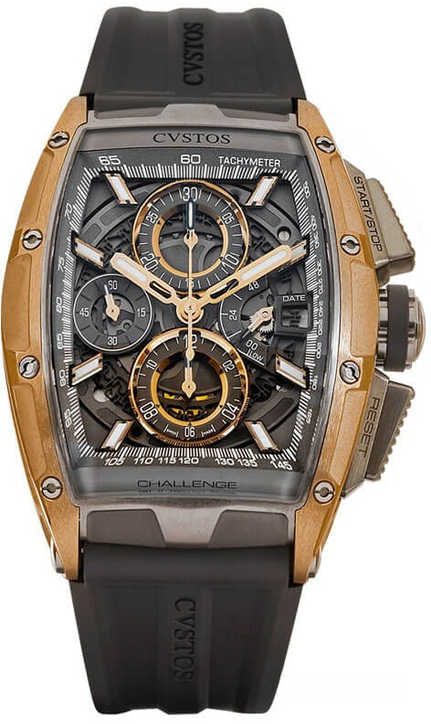 Часы представлены в корпусе из розового золота 18к и титана размером 45 х 59 мм. Комплектуются каучуковым ремешком с вставкой из титана. Циферблат скелетированный. Скелетонизированный круглый диск с набором чисел, в окошке на 3 часах показывает дату. По соседству занял место ретроградный индикатор запаса хода. В положении 12-ти часов разместился 30-минутный счетчик хронографа, а на 6 часах - таймер, выполняющий учет времени. Секундомеру в целях удобства считывания показаний было отведено место на 9-ти часах. Часовой механизм автоматический, Калибр CVSTOS 577, на 25 рубинах. Балансовая частота составляет 28 800 п/ч, запас хода - 42 часа.