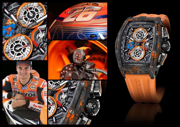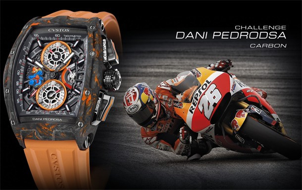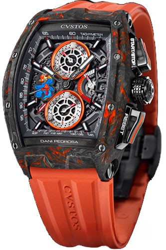 Корпус Nano Orange Carbon содержит объемный многослойный скелетированный циферблат с вручную выполненным логотипом Дени Педроса в позиции 9 часов. Часы с минутным в позиции 12 часов и часовым возле 6 часов счетчиками в форме тормозных дисков оснащены ремешком в оранжевых тонах нового мотоцикла RC213V Repsol Honda. Индикатор запаса хода в позиции 3 часов напоминает красную часть тахометра. Возле 9 часов вручную нарисован логотип маленького самурая. Небольшая дополнительная деталь: на индикаторе даты число 26 выделено красным цветом. Часовой механизм автоматического хронографа собран и оформлен в мастерских Cvstos в Женеве и включает ротор, похожий на обод со спицами мотоцикла Repsol Honda RC213V. Этот ротор использует уже разработанную и утвержденную Cvstos технологию вольфрам 88/титан класса 5. Часы Dani Pedrosa Carbon выпущены ограниченной серией из 100 единиц.