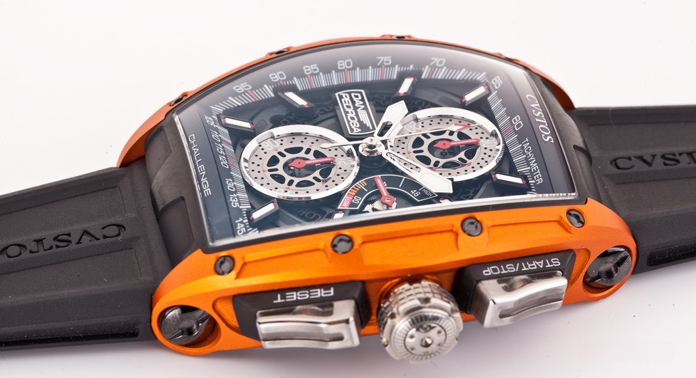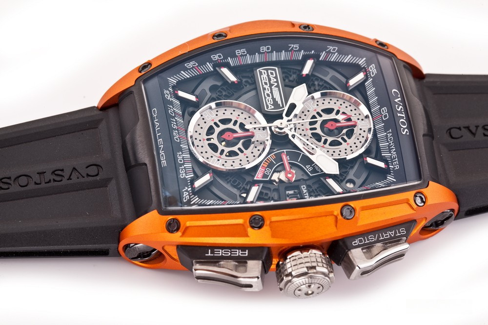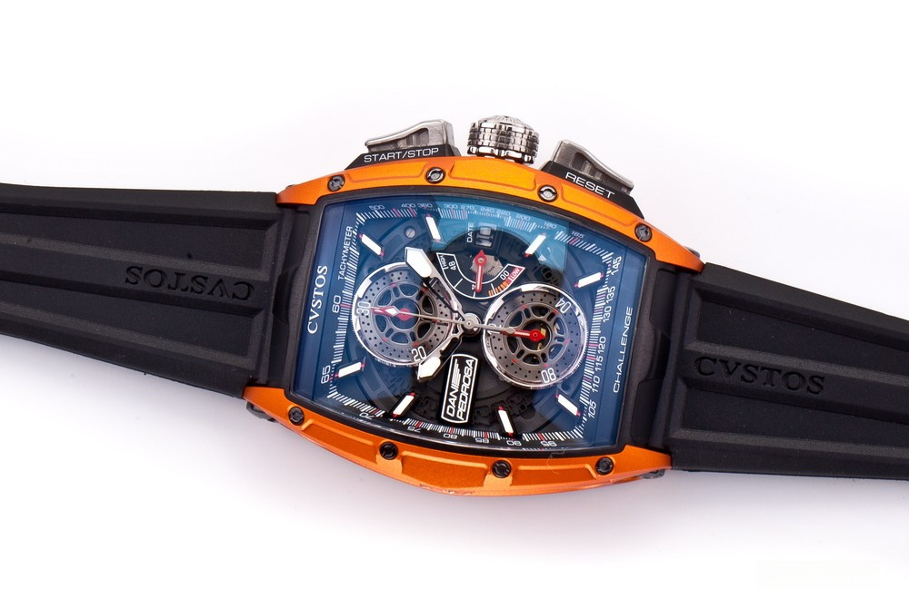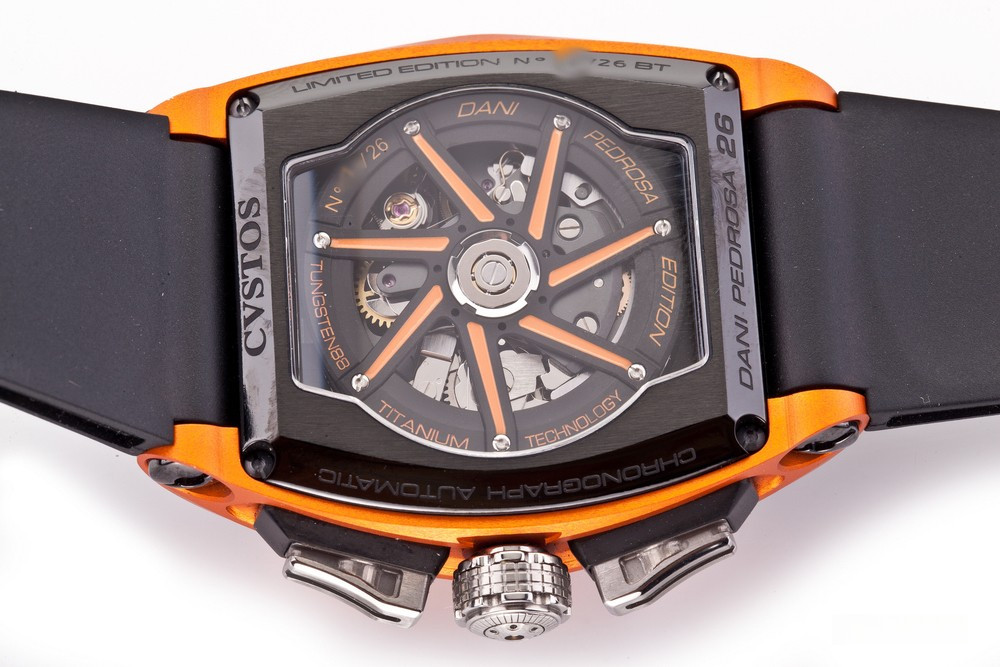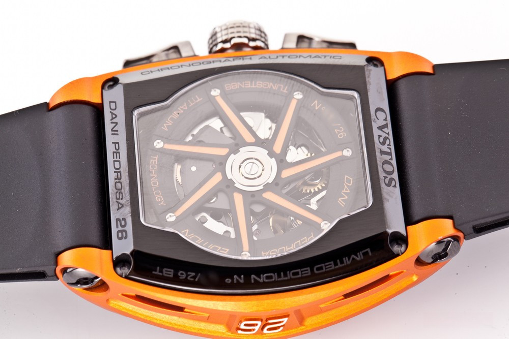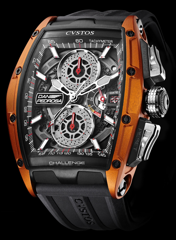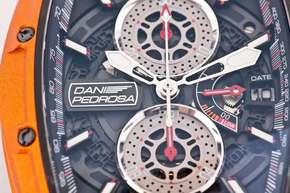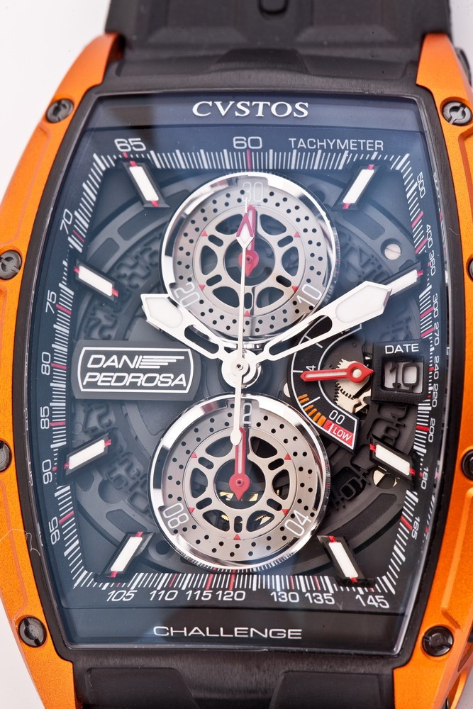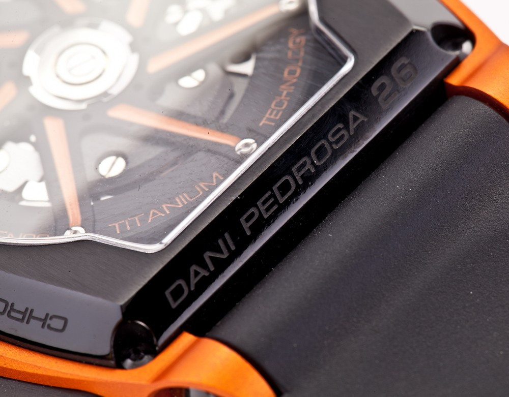 Часы Challenge Dani Pedrosa Orange Limited Edition - спортивный хронограф, выпущенный в честь известного гонщика. Корпус часов размером 53.7 х 41 мм изготовлен из титана и алюминия с покрытием PVD. Водонепоницаемость составляет 100 метров. Внутри корпуса находится автоматический механизм CVSTOS 577 с запасом хода 42 часа и функциями часов, минут, секунд, даты и запаса хода. Черный с серебристым циферблат скелетирован. Элементы дизайна часов напоминают гоночный автомобиль. Часы выпущены ограниченной серией 26 штук и поставляются на черном каучуковом ремешке с титановой застежкой.