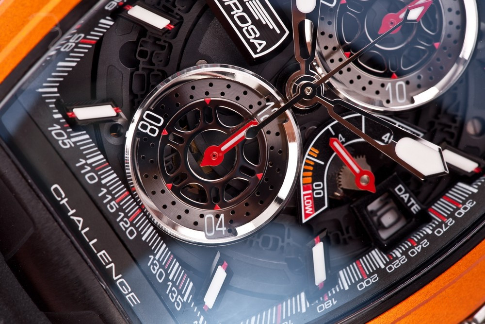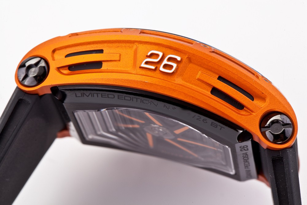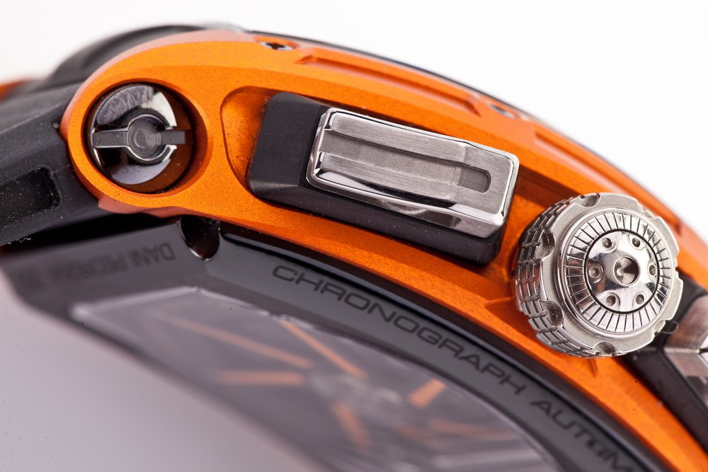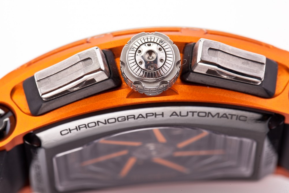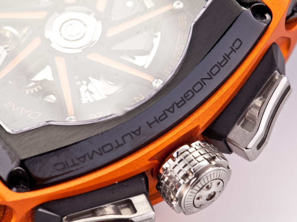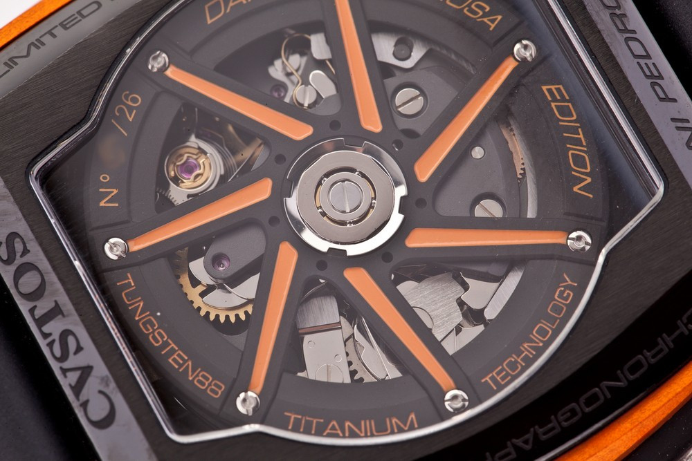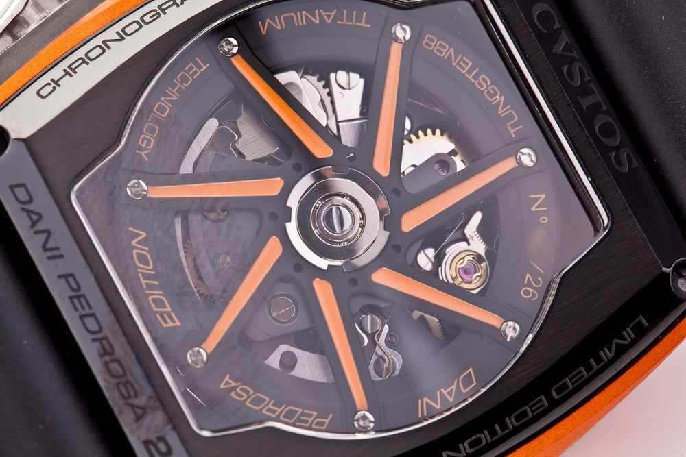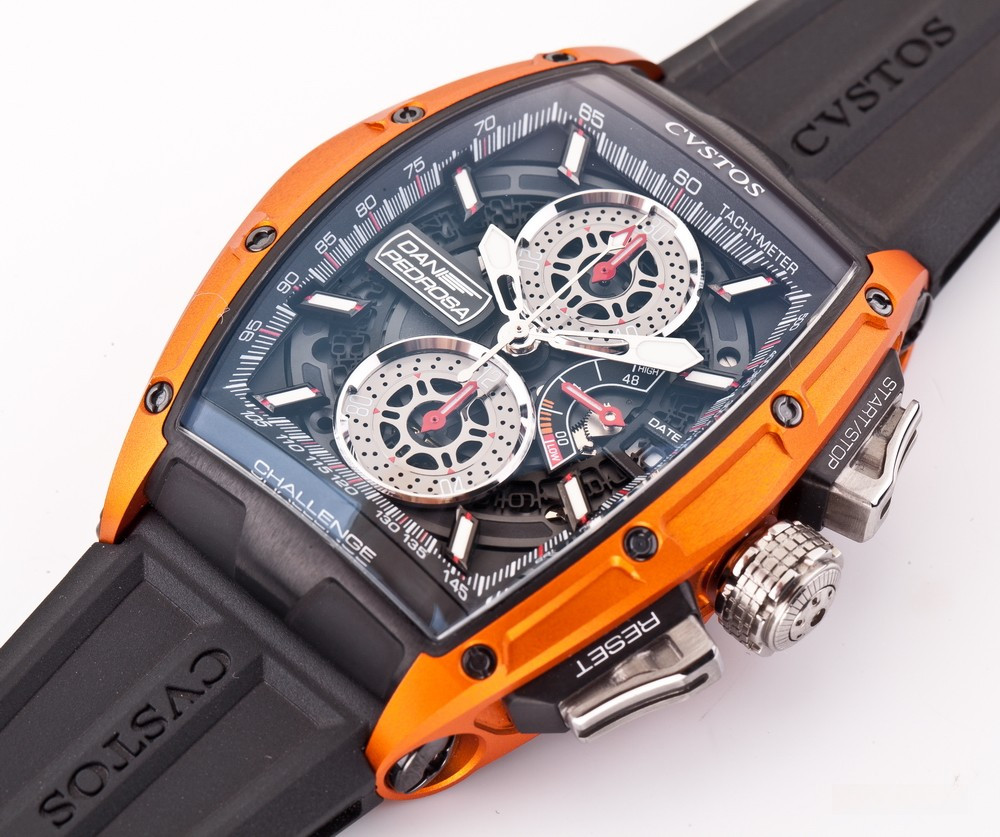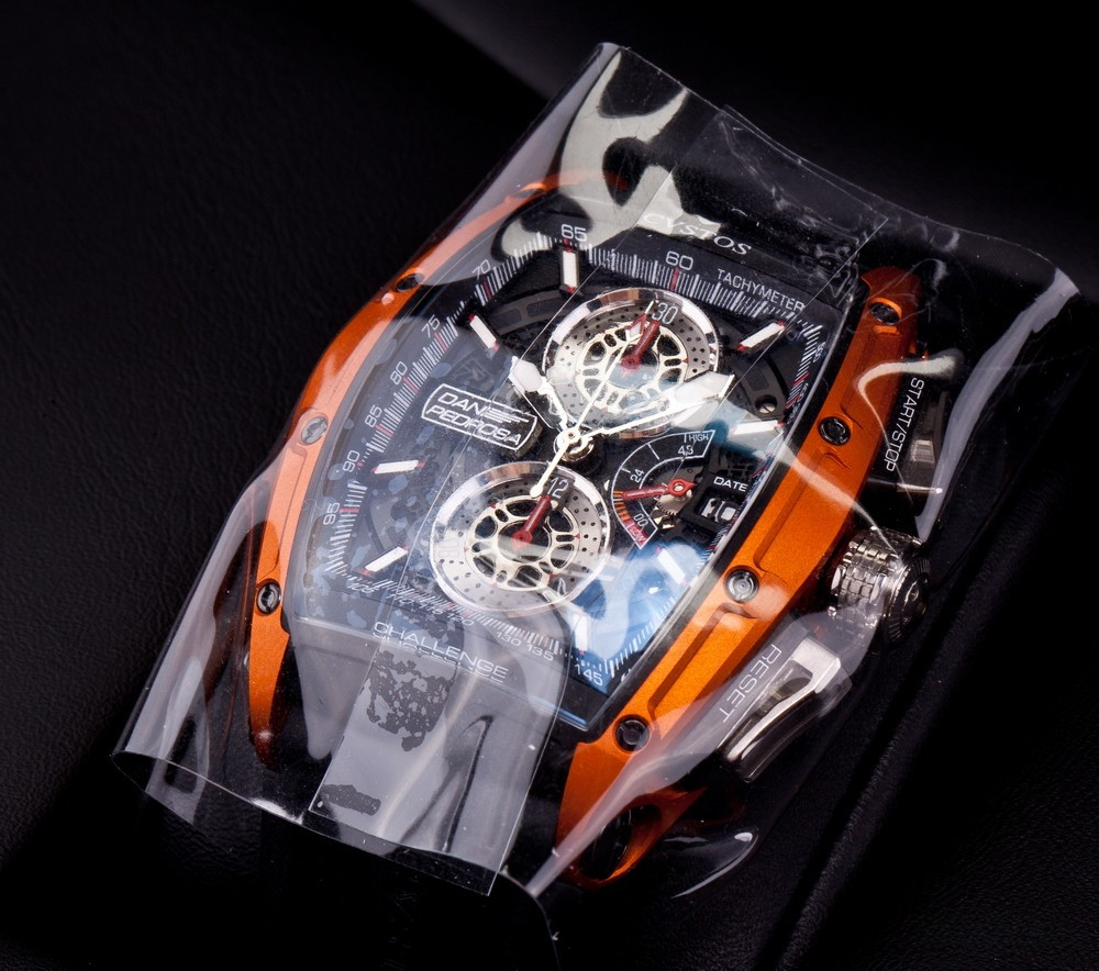 Часы Challenge Dani Pedrosa Orange Limited Edition - спортивный хронограф, выпущенный в честь известного гонщика. Корпус часов размером 53.7 х 41 мм изготовлен из титана и алюминия с покрытием PVD. Водонепоницаемость составляет 100 метров. Внутри корпуса находится автоматический механизм CVSTOS 577 с запасом хода 42 часа и функциями часов, минут, секунд, даты и запаса хода. Черный с серебристым циферблат скелетирован. Элементы дизайна часов напоминают гоночный автомобиль. Часы выпущены ограниченной серией 26 штук и поставляются на черном каучуковом ремешке с титановой застежкой.