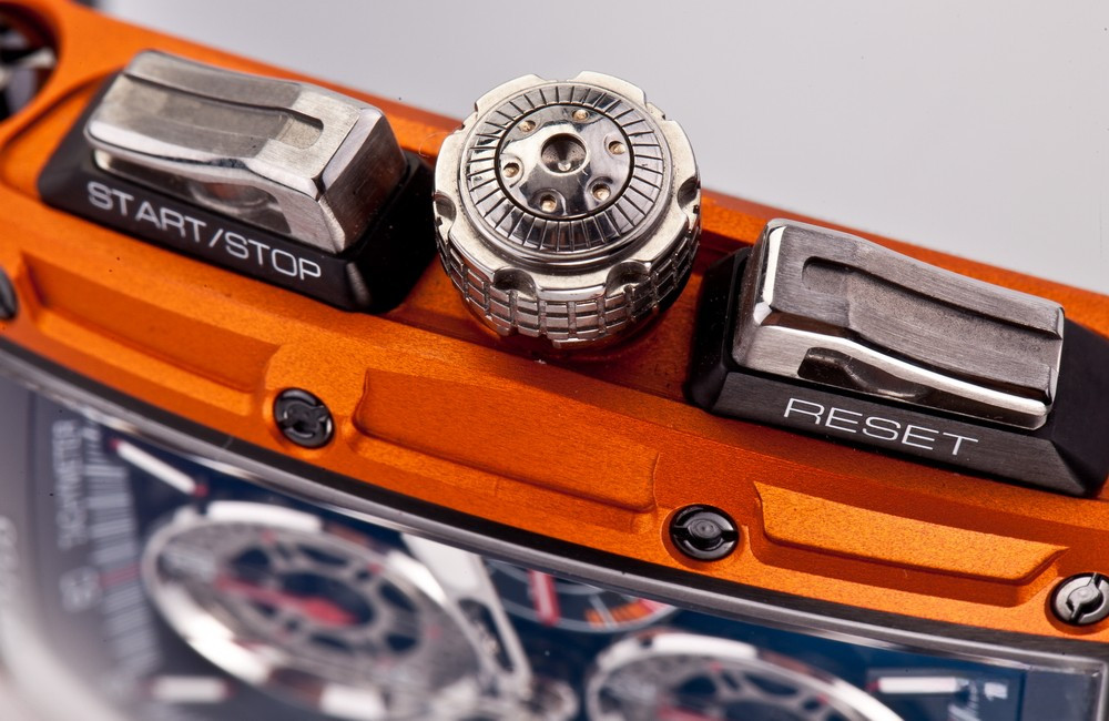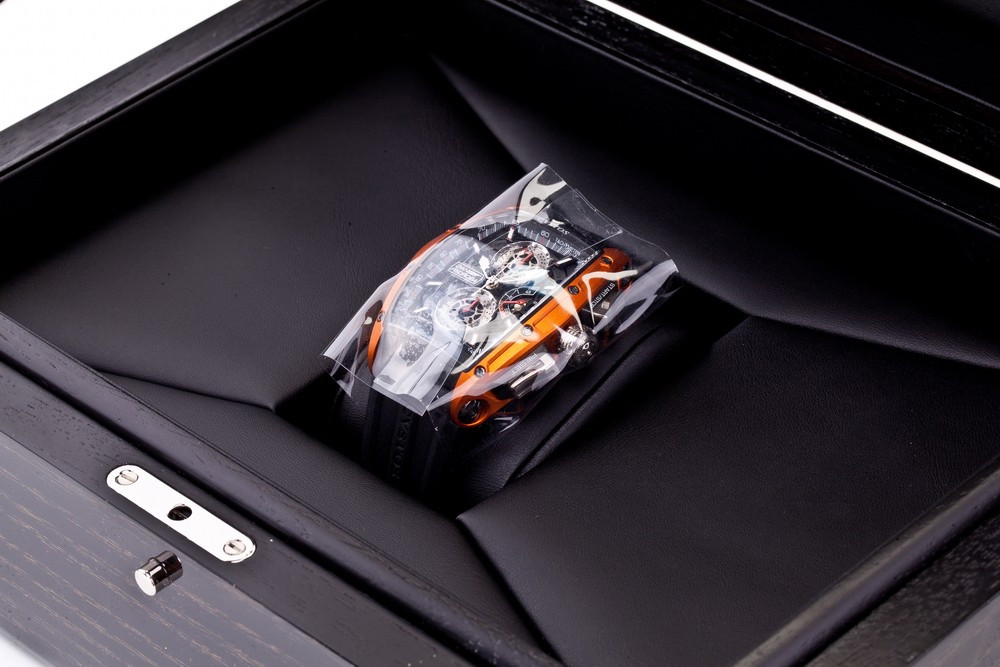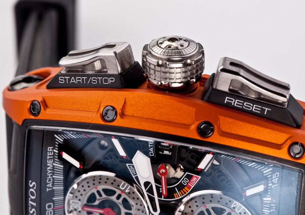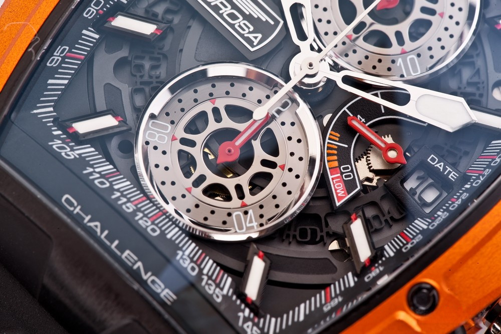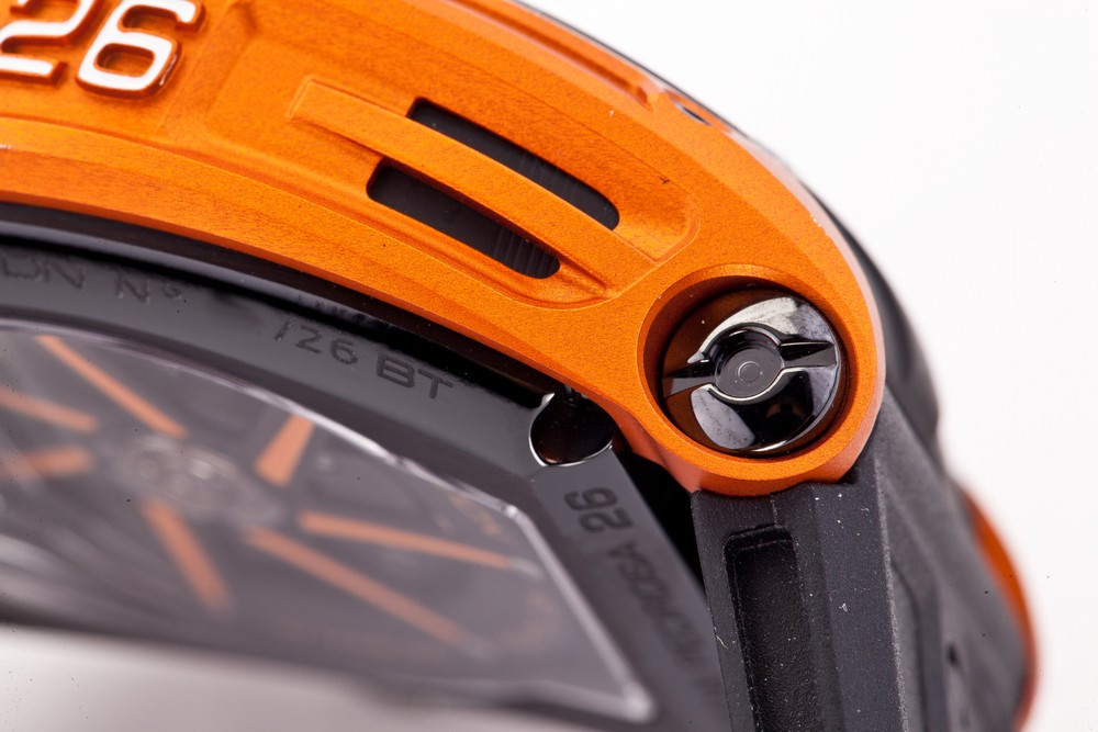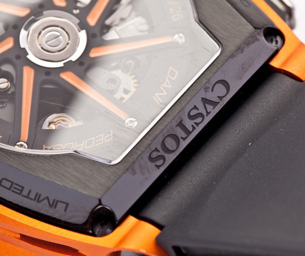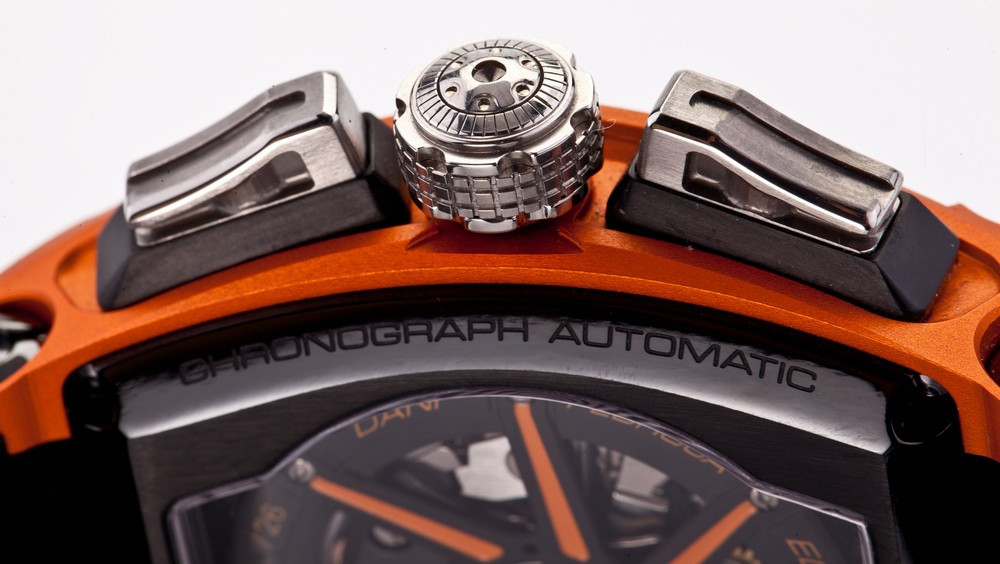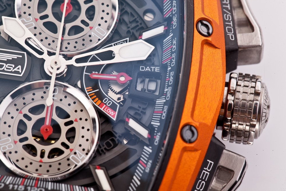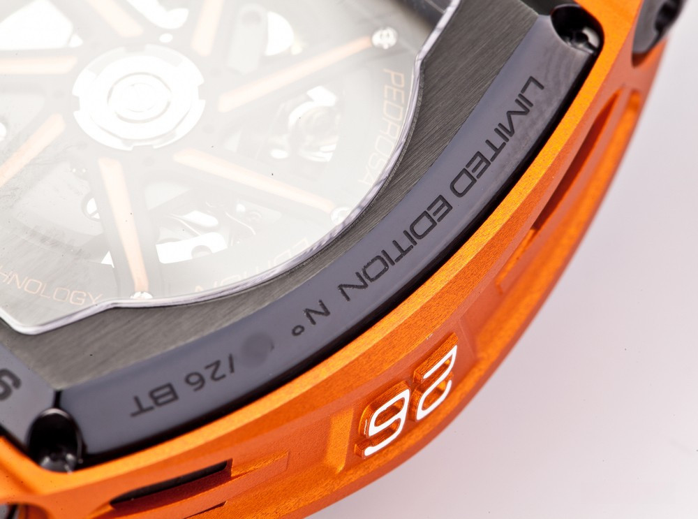 Часы Challenge Dani Pedrosa Orange Limited Edition - спортивный хронограф, выпущенный в честь известного гонщика. Корпус часов размером 53.7 х 41 мм изготовлен из титана и алюминия с покрытием PVD. Водонепоницаемость составляет 100 метров. Внутри корпуса находится автоматический механизм CVSTOS 577 с запасом хода 42 часа и функциями часов, минут, секунд, даты и запаса хода. Черный с серебристым циферблат скелетирован. Элементы дизайна часов напоминают гоночный автомобиль. Часы выпущены ограниченной серией 26 штук и поставляются на черном каучуковом ремешке с титановой застежкой.