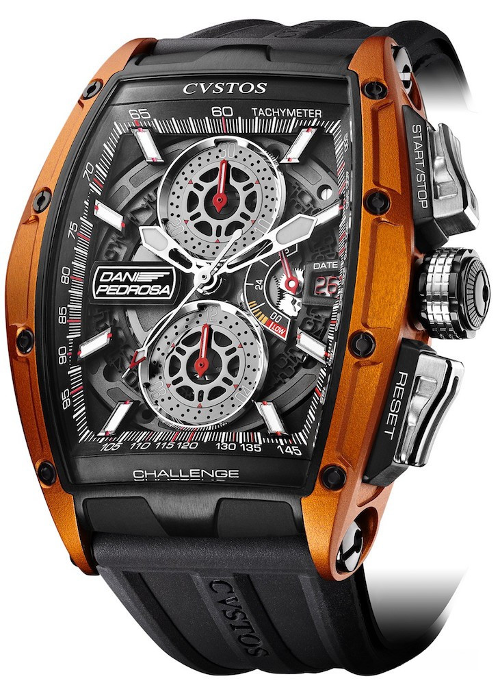 Корпус Nano Orange Carbon содержит объемный многослойный скелетированный циферблат с вручную выполненным логотипом Дени Педроса в позиции 9 часов. Часы с минутным в позиции 12 часов и часовым возле 6 часов счетчиками в форме тормозных дисков оснащены ремешком в оранжевых тонах нового мотоцикла RC213V Repsol Honda. Индикатор запаса хода в позиции 3 часов напоминает красную часть тахометра. Возле 9 часов вручную нарисован логотип маленького самурая. Небольшая дополнительная деталь: на индикаторе даты число 26 выделено красным цветом. Часовой механизм автоматического хронографа собран и оформлен в мастерских Cvstos в Женеве и включает ротор, похожий на обод со спицами мотоцикла Repsol Honda RC213V. Этот ротор использует уже разработанную и утвержденную Cvstos технологию вольфрам 88/титан класса 5. Часы Dani Pedrosa Carbon выпущены ограниченной серией из 100 единиц.