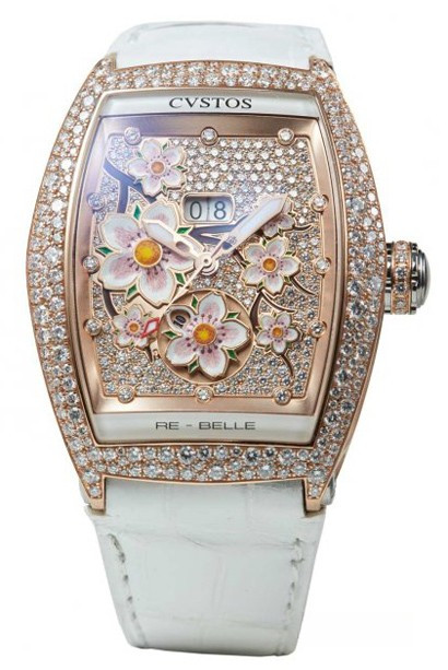 Часы Cvstos Re-Belle Sakura выпущены в корпусе из розового золота 18к, размером 47.2 х 36 мм с водонепроницаемостью 100 м. Внутри корпуса установлен автоматический механизм, Калибр CVSTOS 551. На циферблате с белыми бриллиантами и мотивом цветущей сакуры из эмали отображаются часы, минуты, секунды, дата. Запас хода 42 часа. Часы комплектуются ремешком из кожи аллигатора с вставкой из розового золота 18к. Корпус инкрустирован белыми бриллиантами.
