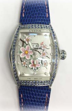 Часы Cvstos Re-Belle Sakura выпущены в корпусе из нержавеющей стали размером 47.2 х 36 мм с водонепроницаемостью 100 м. Внутри корпуса установлен автоматический механизм, Калибр CVSTOS 551. На белом жемчужном циферблате с 12-ю белыми бриллиантами и мотивом цветущей сакуры из эмали отображаются часы, минуты, секунды, дата. Запас хода 42 часа. Часы комплектуются ремешком из кожи страуса с вставкой из нержавеющей стали. Корпус инкрустирован синими сапфирами.