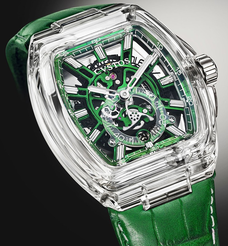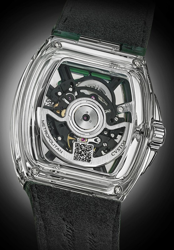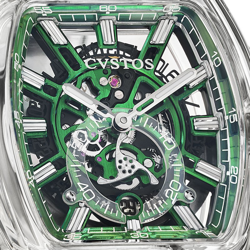 Часы Cvstos Metropolitan PS Skeleton Sapphire Green представлены в корпусе из сапфира размером 42 х 51 мм водонепроницаемостью 50 метров. Внутри корпуса установлен автоматический механизм, Калибр CVS410 SQLT, обладающий запасом хода 50 часов. На зеленом скелетированном циферблате отображаются часы, минуты, дата. Часы поставляются на ремешке из кожи аллигатора с титановой застежкой. Серия огрничена - 50 шт.