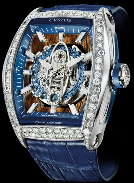 Часы Cvstos Hour Minute Seconde Sealiner представлены в корпусе из нержавеющей стали размером 53.7 х 41 х 13.35 мм и водонепроницаемостью 100 метров. Внутри корпуса установлен автоматический механизм, Калибр CVS350, обладающий запасом хода 42 часа. На серебристом с синим скелетированном циферблате отображаются часы, минуты, секунды, дата. Модель комплектуется каучуковым ремешком с вставкой из нержавеющей стали. Безель из белых бриллиантов.