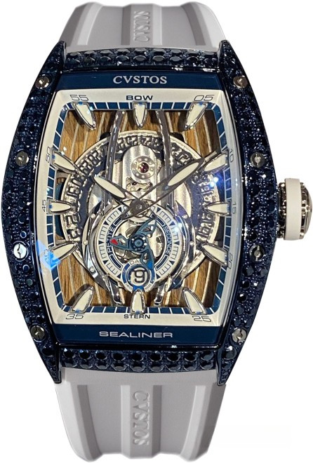 Часы Cvstos Sealiner PS представлены в корпусе из нержавеющей стали размером 41 х 53.7 мм водонепроницаемостью 50 метров. Внутри корпуса установлен автоматический механизм, Калибр CVS410, обладающий запасом хода 45 часов. На серебристом скелетированном циферблате отображаются часы, минуты, секунды, дата. Часы поставляются на каучуковом ремешке с застежкой из нержавеющей стали. Корпус инкрустирован синими сапфирами.