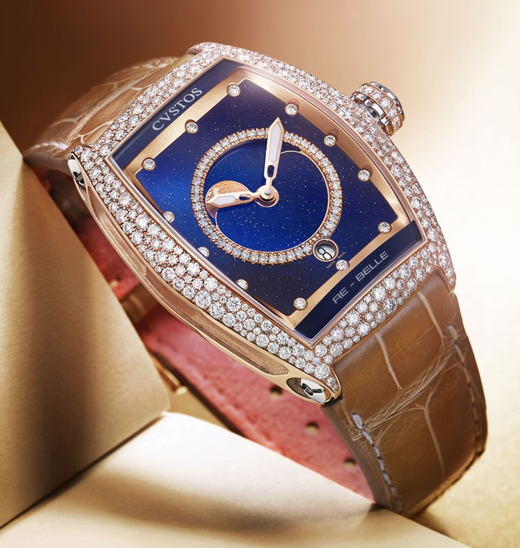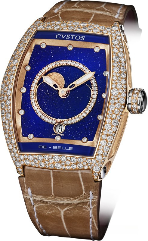 Часы Cvstos Re-Belle Moon представлены в корпусе из розового золота 18к размером 36 х 47.2 мм водонепроницаемостью 100 метров. Внутри корпуса находится автоматический механизм, Калибр CVS882, обладающий запасом хода 38 часов. На синем авантюриновом циферблате с белыми бриллиантами отображаются часы, минуты, дата, фаза луны. Часы поставляются на ремешке из кожи аллигатора с вставкой из розового золота 18к. Корпус инкрустирован белыми бриллиантами. Серия ограничена - 50 шт.